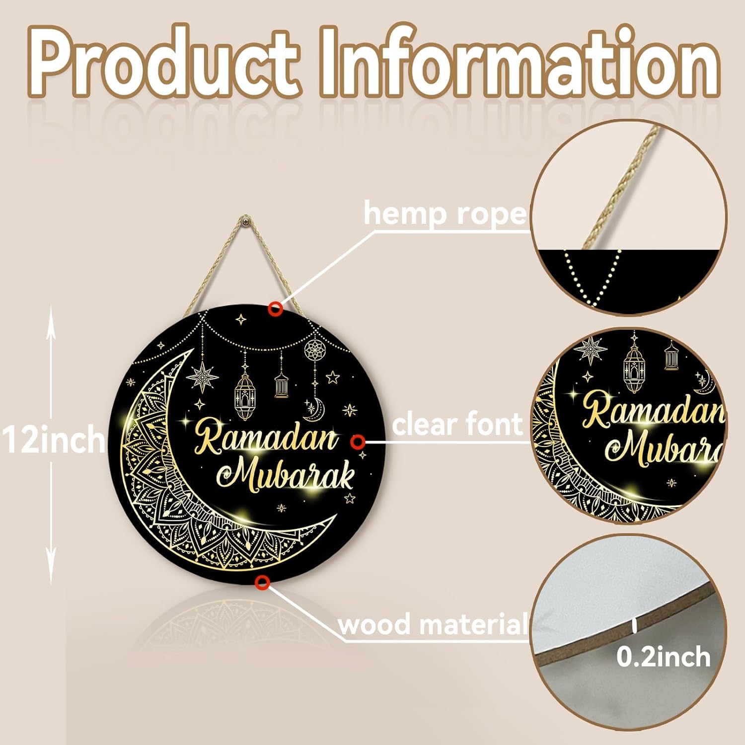đProduct size: This Ramadan Mubarak wooden Hanging sign approximately 30 x30 CM.The bright colors appearance adds a and sacred feeling, it is very suitable as an Ramadan Mubarak decoration.