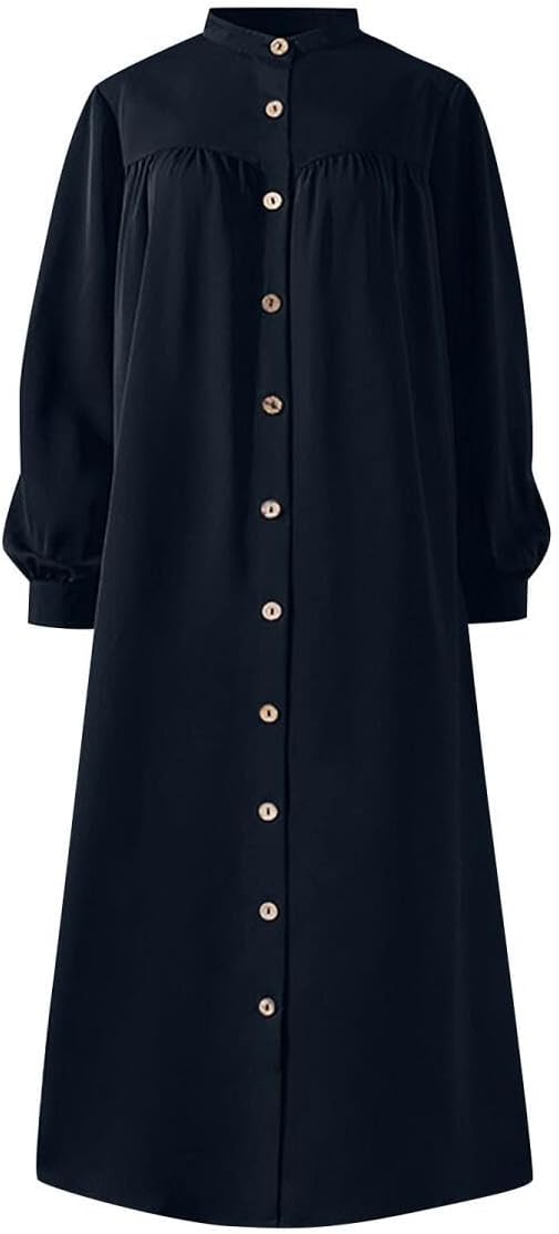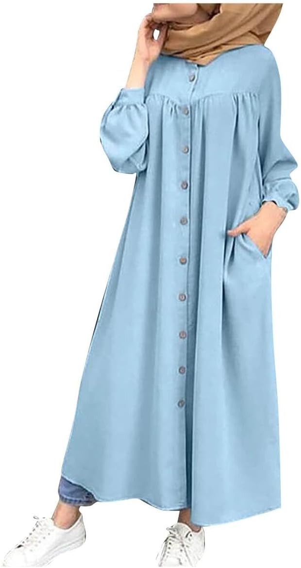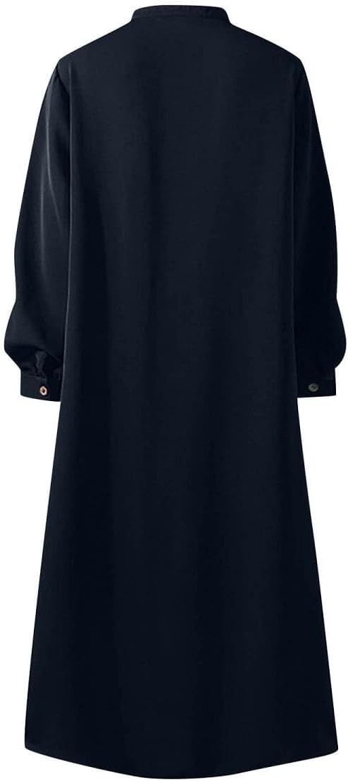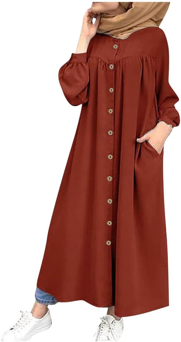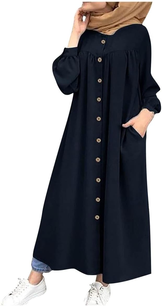 Amuer Muslim Abayas Prayer Dresses,Eid Ramadan One-Piece Soft Breathable Long Sleeve Robe Fashion Round Neck Shirtdress with Button Decor Islamic Plain Abaya Dress for Ramadan Party Prayer