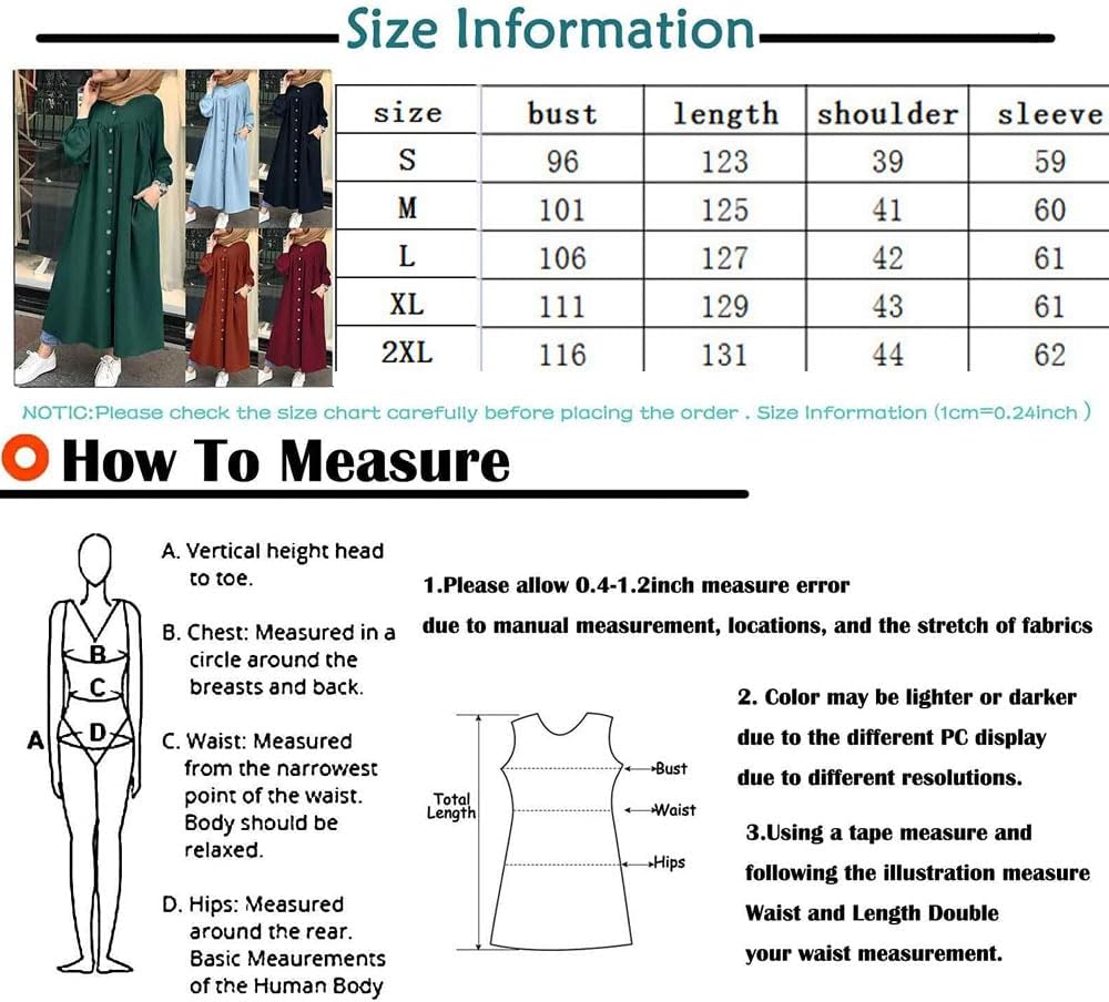 You will receive:1 * Muslim Prayer Dress4 sizes available:M long: 125cmL long: 127cmXL long: 129cmXXL long: 131cmMaxi Long Dress for Formal, Casual, Holiday, Wedding Party; Also Suitable for Eid, Ramadan or Other Occasions, it Can Be Given As A Gift to Female Friends Around.