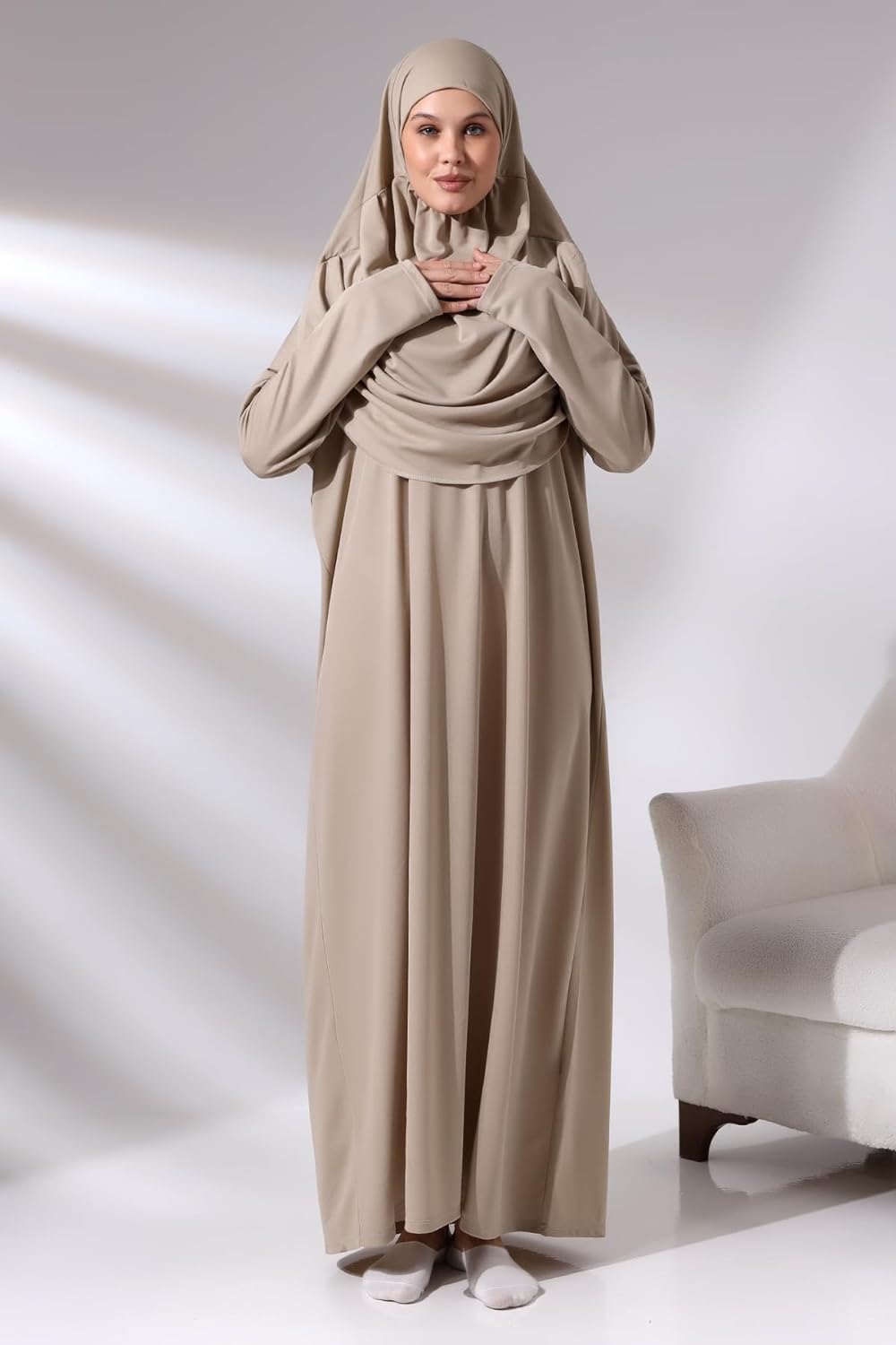 - ✔ THOUGHTFUL DESIGN FOR PRAYERS - Our Islamic women's dress features a practical hood that stays securely in place. The chin section of the hood is narrowed with elastic, ensuring your neck and hair are concealed during prayer. No bonnet required. From the front and back, the hood resembles a half cape and covers your shoulders to the chest.