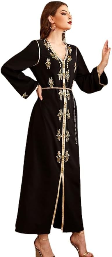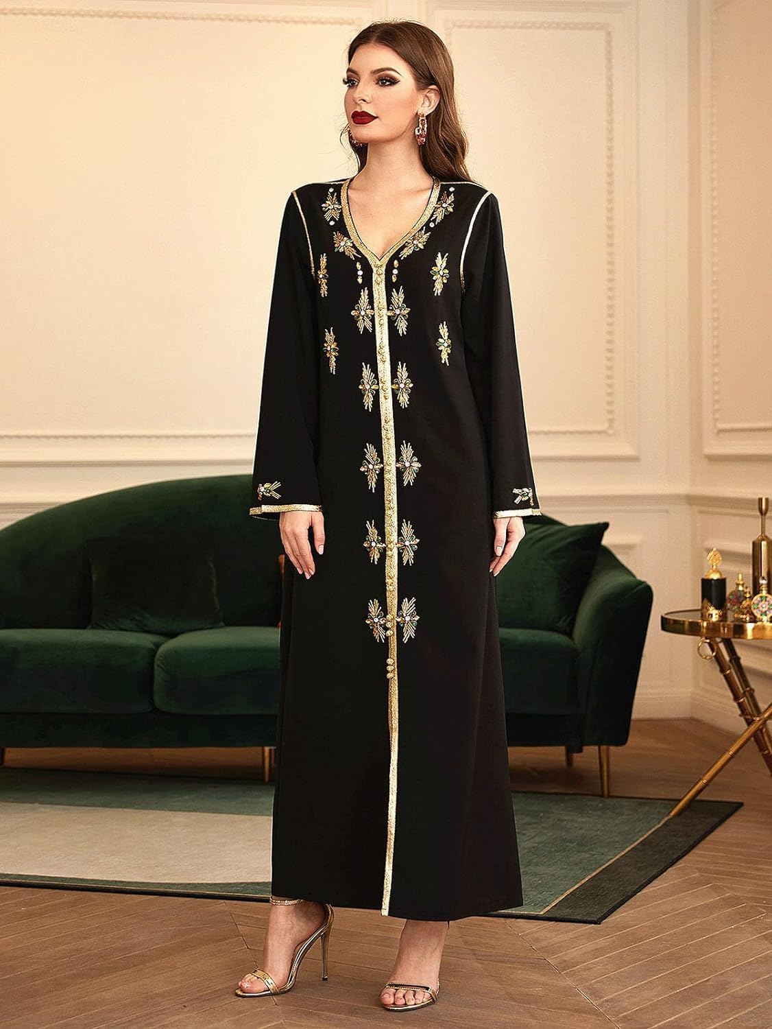 Women's Muslim Robe, V-neck gold trim with sparkling rhinestones Loose Ramadan Prayer Dress, Casual Holiday Travel Middle East Dubai Arabic Islamic Ramadan Robe Maxi Dress,Black,L