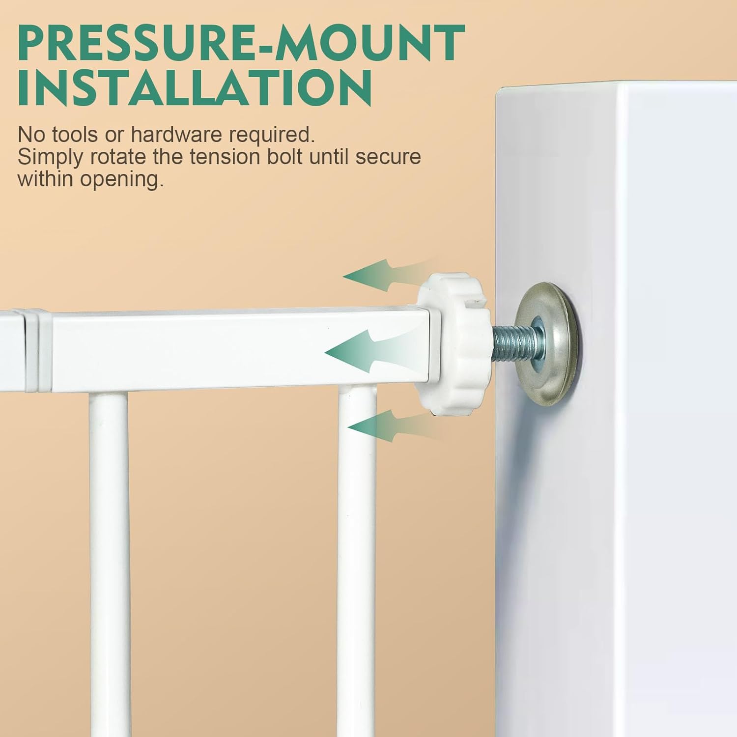 【Large & wide】 76cm height & 75-114 cm width, This white gate is suitable for most doors! Our large walk thru gate makes it easier to walk when holding the baby. Easy to use, 5-minute installation with tools provided. The extra wide walk-through stairgate is made from strong steel, with no drilling needed.