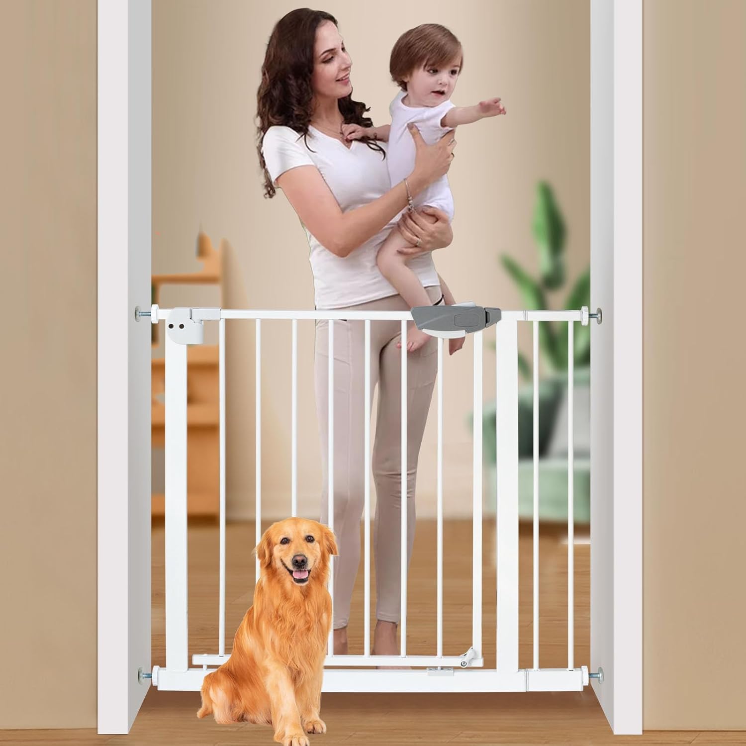 【Durable design】steel design baby gate can defend up to 150 pound impacts by Husky, Alaska etc. without budging at all! You do not need to worry about the baby gate being pushed down and hurting your children, great for a family with child and pet.