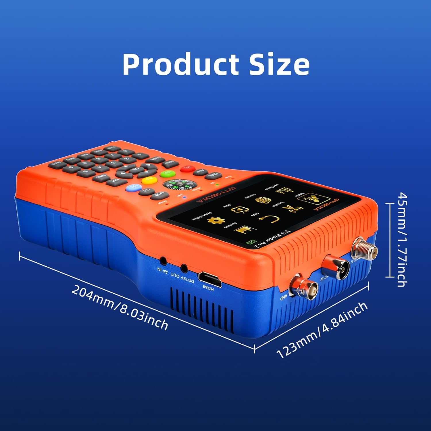 GTMEDIA V8 Finder Pro is a DVB-S2X/S2/S/T2/T/C and MPEG-2/4 H.264/H.265 (10 bit) compliant handheld combo meter, With its compact size, light weight, intuitive user's interface, long operational hours and rich feature set, the meter provides all functions needed for installation and verification of digital satellite TV service, antenna signal and cable signal to residential homes or multi-dwelling units.Key Features: ● 4.3 Inch High Definition TFT LCD Screen ● Fully DVB-S2X/S2/S/T2/T/C, MPEG-2/MPEG-4 compliant ● Support H.264/H.265(10 Bit) Hardware decoding ●Digital measuring device for signal strength and quality.Supports presetting all satellite information ● Support Loop Search ● Constellation analyzer ● Spectrum analyzer ● Supports scan of Auto, Blind, Manual or NIT ● Sound for Locking Signal ● Auto Calculate Angle of AZ,EL ● Supports DISEQC 1.0/1.1/1.2, Unicable, 0/22kHz Tone ● Speaker Integrated ● Support both AV out and AV in ● Support both HDMI out ● Supports AHD camera input ● Support compass function ● Supports Youtube for USB wifi 2.4G ● LNB short protect ● Software upgrade via USB port ● Easy to carry