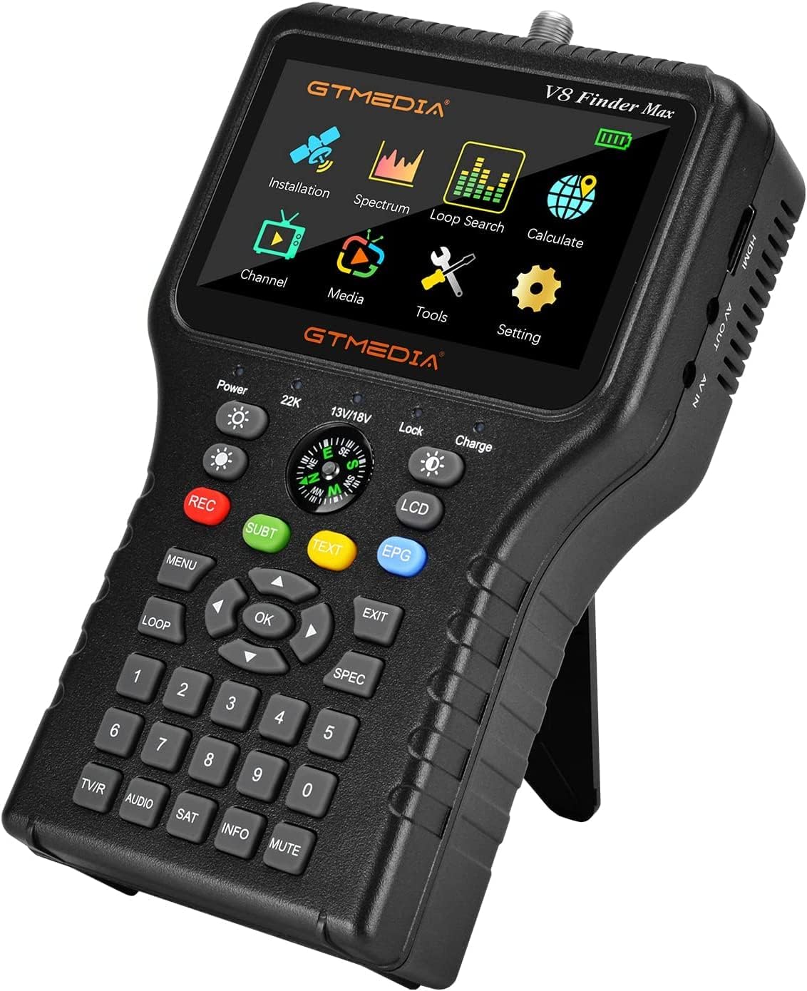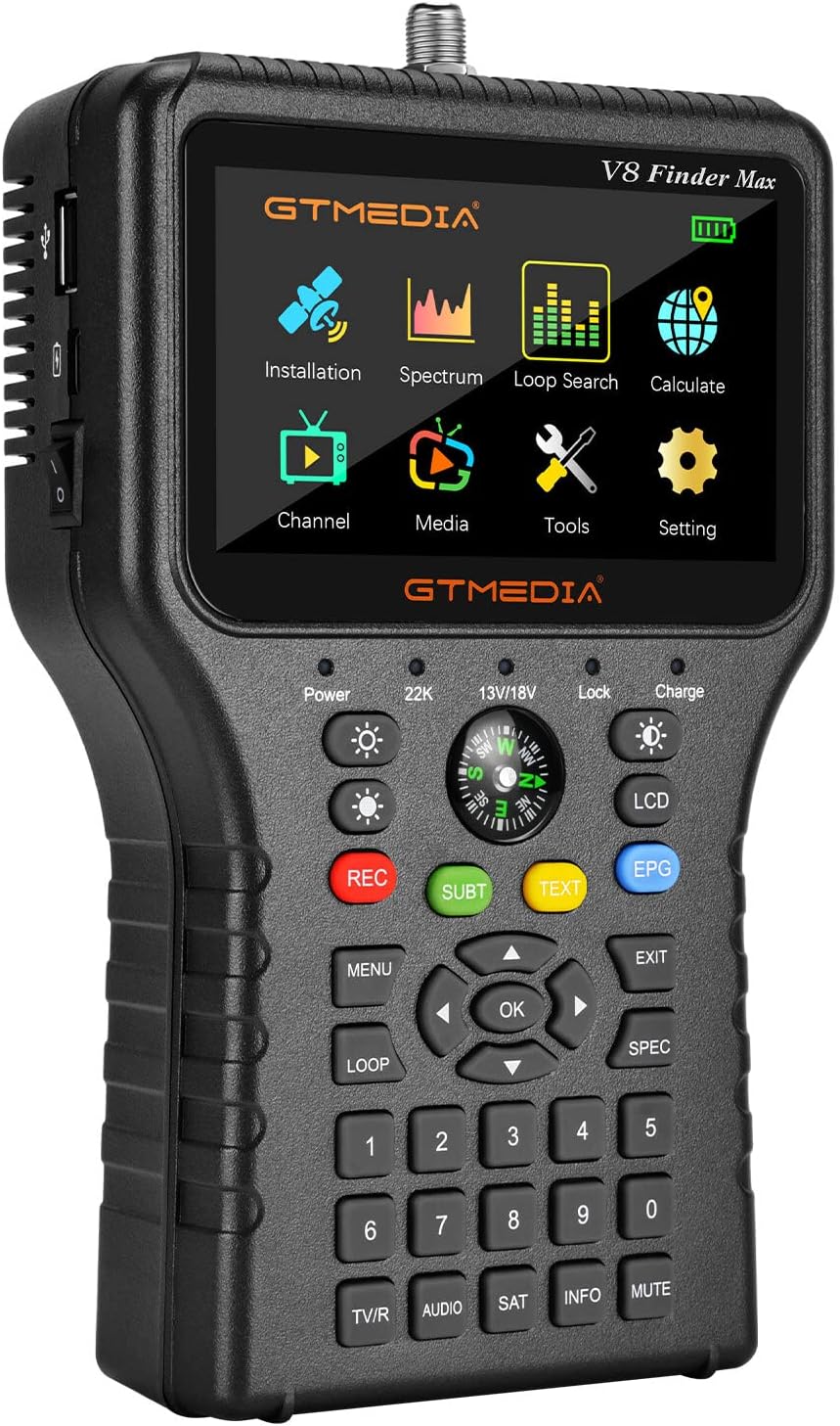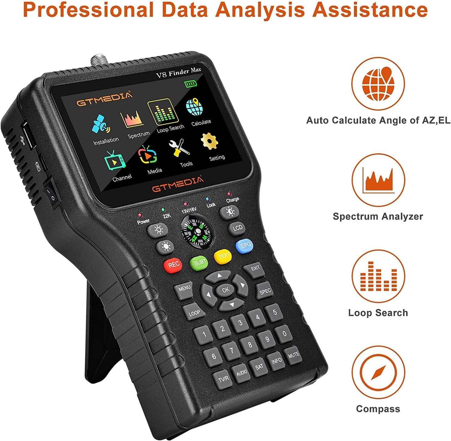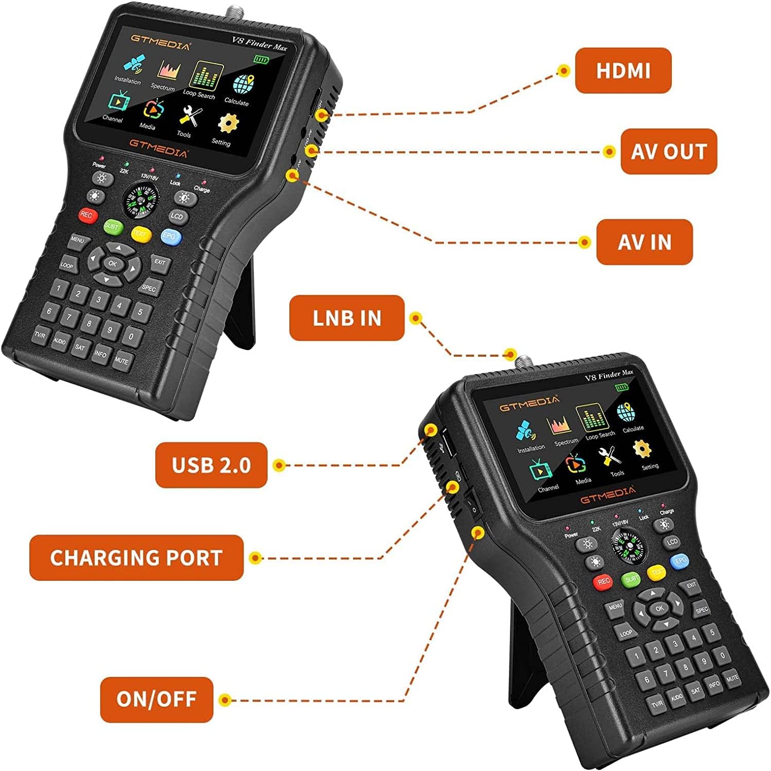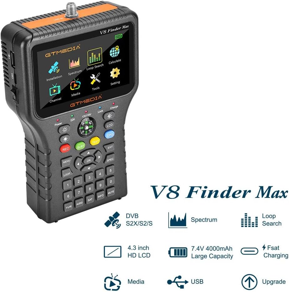 【Sat Finder V8 Findermax】📡 V8 findermax satellite finder is a DVB-S/S2/S2X compliant handheld satellite meter, support multiple kinds of functions such as loop search, spectrum analyzer and auto calculate angle of AZ,EL. V8 findermax is compatible with MPEG-2/4 H.264/H.265 (8 bit) and supports DISEQC 1.0/1.1/1.2, Unicable, 0/22kHz Tone.