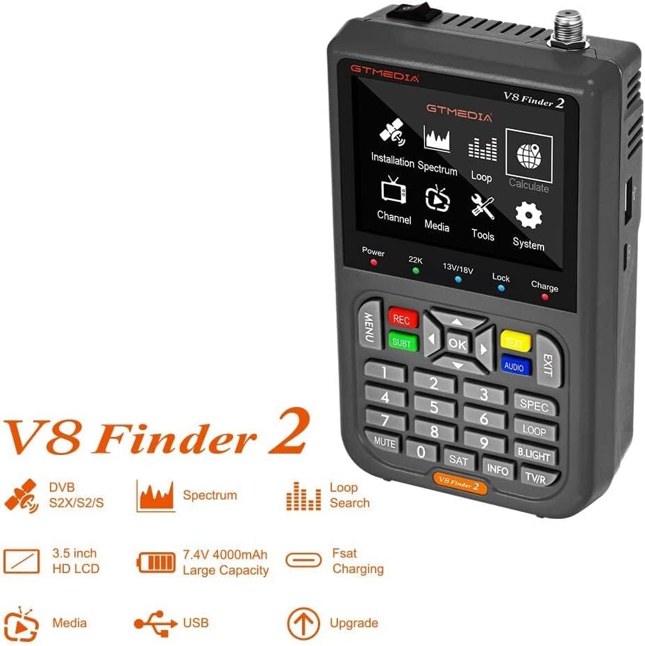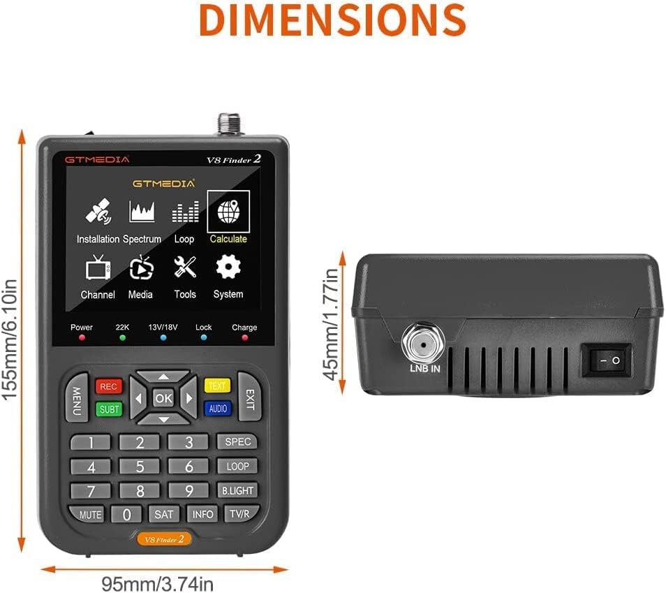 ◕‿◕Measurements of DVB-S/S2/S2X signals, H.264 Hardware decoding. Digital satellite finder meter for quick setup of satellite dishes. ◕‿◕Equipped with 3.5 inch high definition LCD screen. Li-Ion battery (7.4 V /4000 mAh) for up to 4-hour operating time. Sound alarm for locking signal, beep intergrated. ◕‿◕Support both AV in and AV/High Definition out function. Support 13V / 18V / LOCK status panel LED display directly. Support for DiSEqC1.0/1.1/1.2/USALSand 22 kHz Tone. Support batterypower display. ◕‿◕LNB short circuit protection. Equipped with one carry bag, compact size for easy carry round with you. Software upgrade via USB port support. ◕‿◕Channel Search: Channel search in automatic, manual and network search. OSD. Hardware Parameters: ✅Video: TV System: Automatic PAL/NTSC conversion Video Resolution: 720 * 576, 720 * 480, 1920 * 1080P ✅Audio: Type: MONO Sampling rates: 32KHz, 44.1KHz, 48KHz ✅Configuration: CPU: Ali M3S10 DDR: 1G Flash: 64M SPI Demodulation: M1502 + Tuner M3031 LCD Features: 3.5 inch TFT-LCD Screen Display Format: 320RGB * 240 Active area: 70.07(H) * 52.56 (V) MM LED Indicator: Support 7 different state different color LED display Button: 28 key operation ✅Rear Panel: LNB IN: Frequency Range 950MHz to 2150MHz High Definition OUT: up to 1080P AV OUT: 4-pin 3.5mm * 14mm jack 1 * USB port (Software upgrades for USB) DC IN: 12V, 1.5A ✅LNB Input: Connector: F type, male Frequency Range: 950MHz-2150MHz ✅Demodulator: Front End: QPSK, QPSK Modulation Range: 2Mbps-45Mbps SCPC and MCPC Capable: Yes Spectral Inversion: Auto Conversion ✅ Correction Rate: 1/4, 1/3, 2/5, 3/5, 2/3, 3/4, 4/5, 5/6, 8/9, 9/10 Carrier Frequency Acquisition Range: ±5MHz for symbol rates above 3 Msps and ±3MHz for the remaining symbol rates Code Rates: 1/2, 2/3, 3/4, 5/6, 7/8 Battery: 7.4V 4000mAh Li-ion Battery Powersupply: DC 12V / 1.5A (Input 100-240V, 50/60Hz)