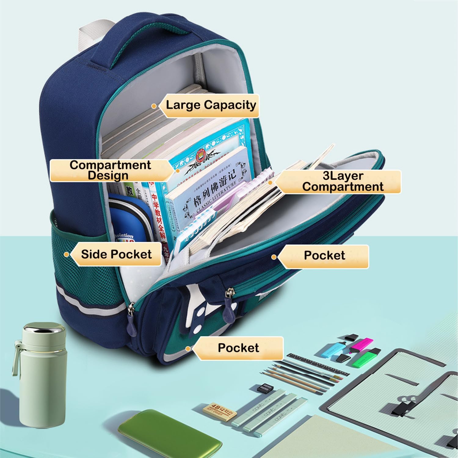 - Well-organized: The school backpacks for kids has a main pocket with compartments for child's daily school supplies, two front pockets with zippers to organize small items, and an attached personalized name label inside to prevent the bag from getting lost. Two side pockets for milk and water bottles or umbrellas