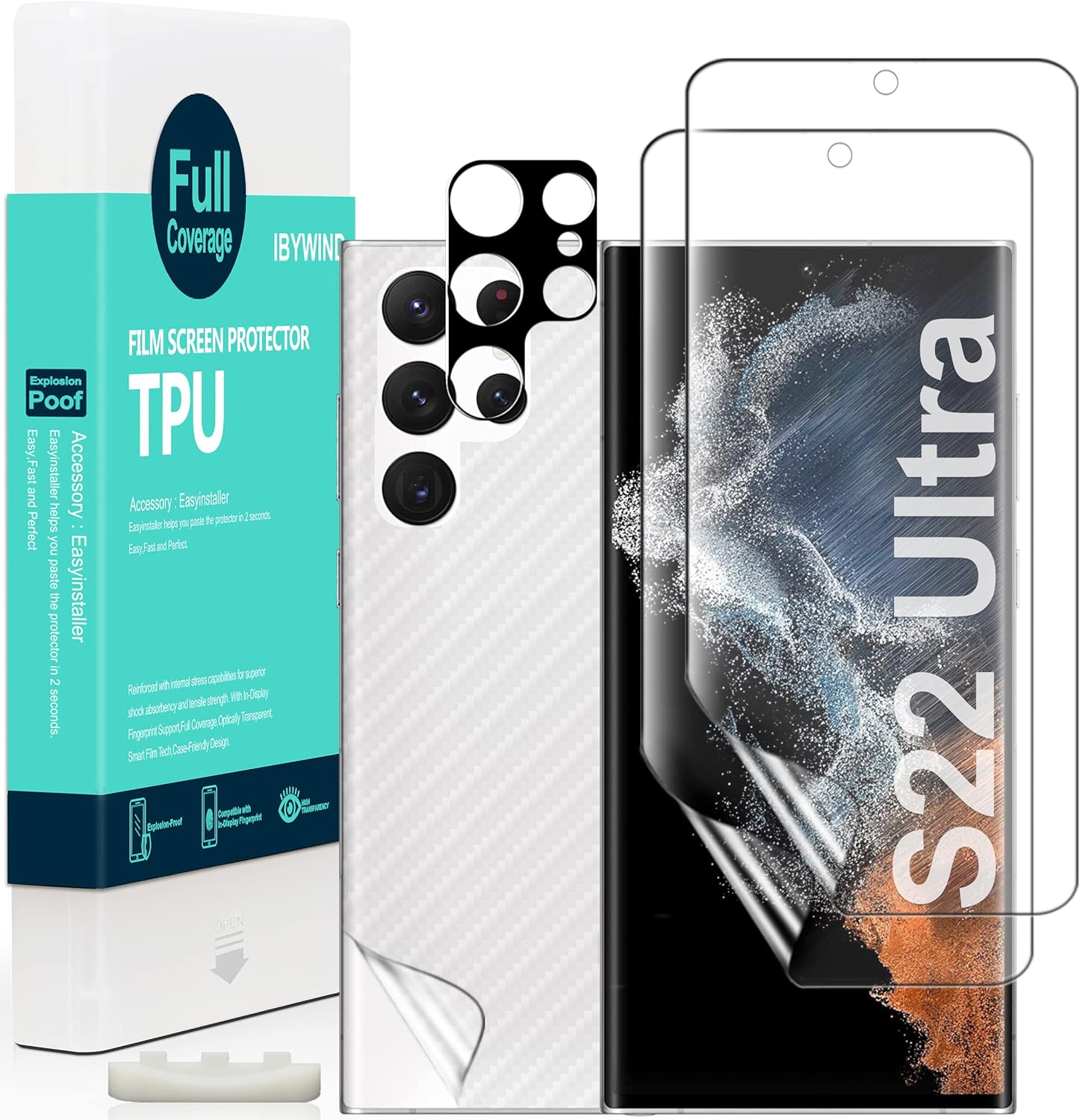 IBYWIND [Pack of 2] Samsung Galaxy S22 Ultra 5G Screen protector (6.8 Inch) with Camer lens protector and Back Carbon Fiber Film,Bubble-Free,Smart Film Tech,99% HD Clear,Easy to install