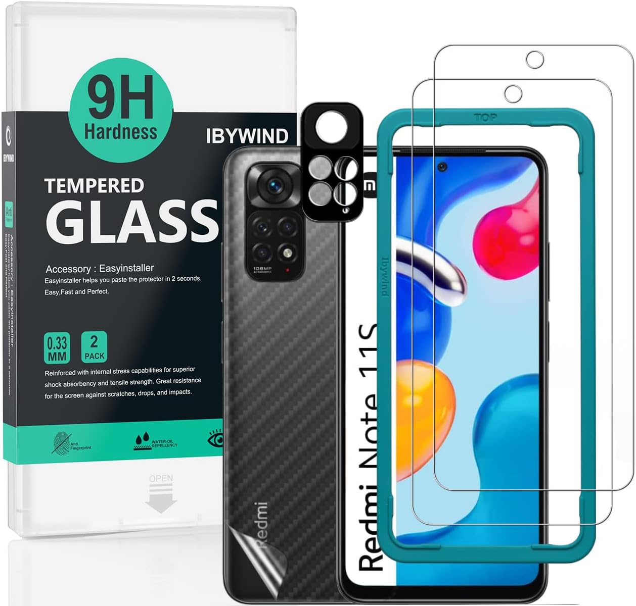 IBYWIND [Pack of 2] Screen Protector for Redmi Note 11S 4G 6,43",Metal Camera Lens Protector,Back Carbon Fiber Skin Protector,Including Easy Install Kit