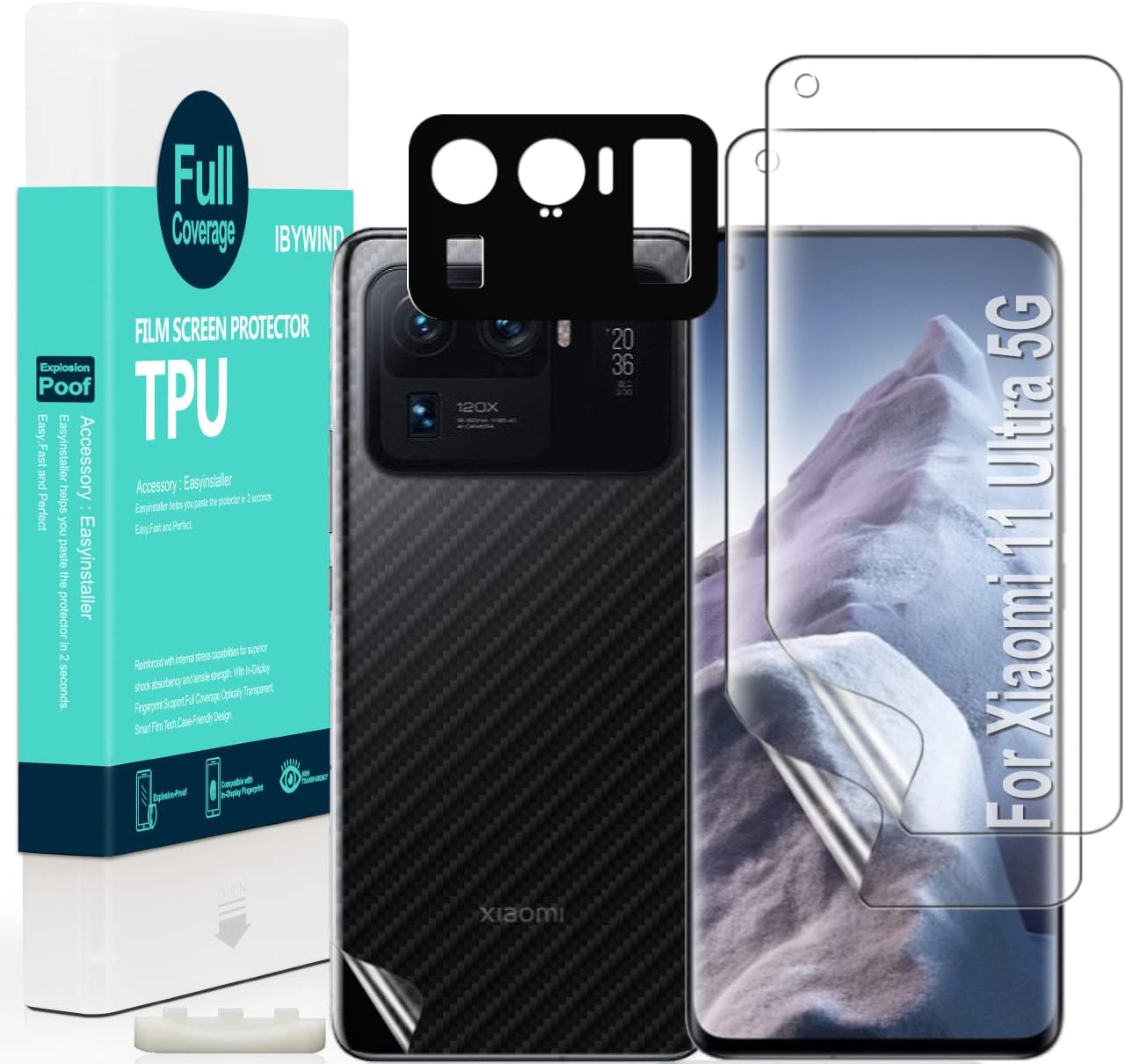 IBYWIND [Pack of 2] Screen Protector for Xiaomi Mi 11 Ultra 5G/4G,[Camera Lens Protector(Metal Material)][Back Carbon Fiber Film Protector][In-Display Fingerprint Support][Bubble Free]