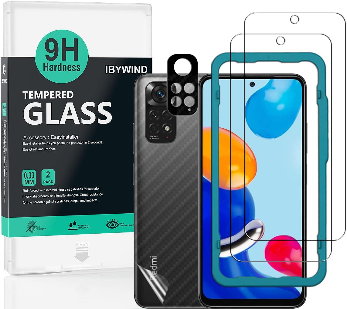 IBYWIND [Pack of 2] Screen Protector for Xiaomi Redmi Note 11 4G 6,43",with Metal Camera Lens Protector,Back Carbon Fiber Skin Protector,Including Easy Install Kit