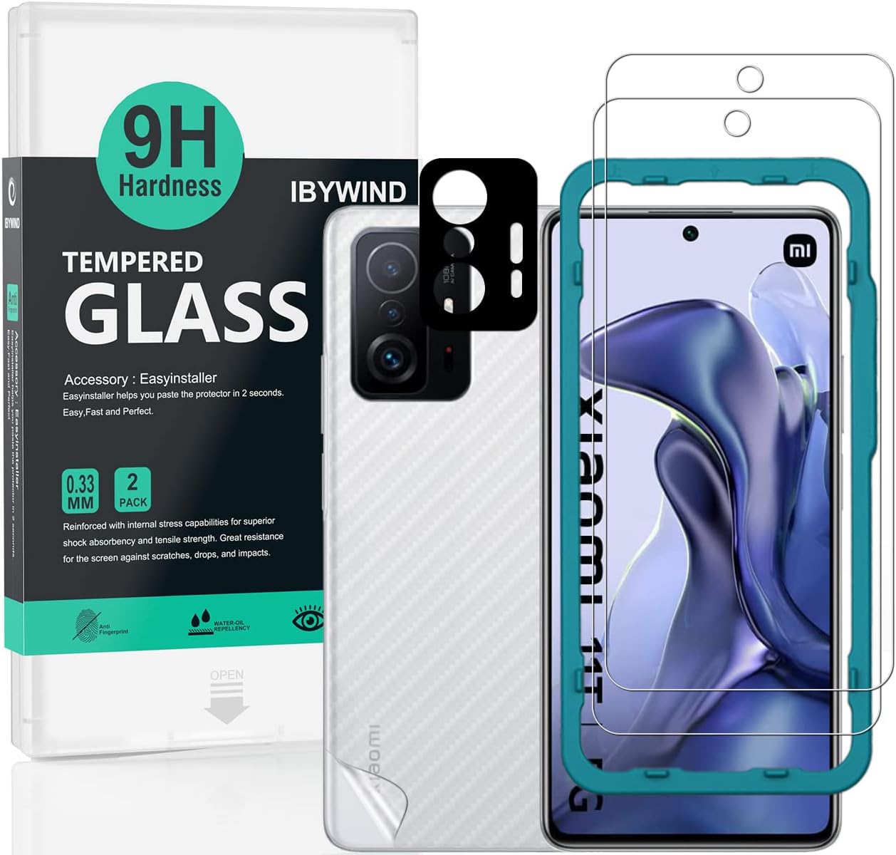 IBYWIND [Pack of 2] Xiaomi 11T 5G/Xiaomi 11T Pro 5G Screen protector (6.67 Inch) with Camer lens protector and Back Carbon Fiber Film,Bubble-Free,9H Tempered Glass,Scratchproof,Easy to install