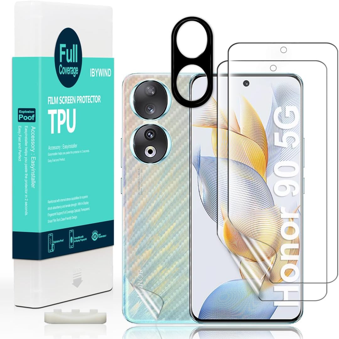 IBYWIND Screen Protector For Honor 90 5G 6.7",with 2Pcs Flexible TPU Film,1Pc Camera Lens Protector,1Pc Backing Carbon Fiber Film[Fingerprint Reader,Easy to install]