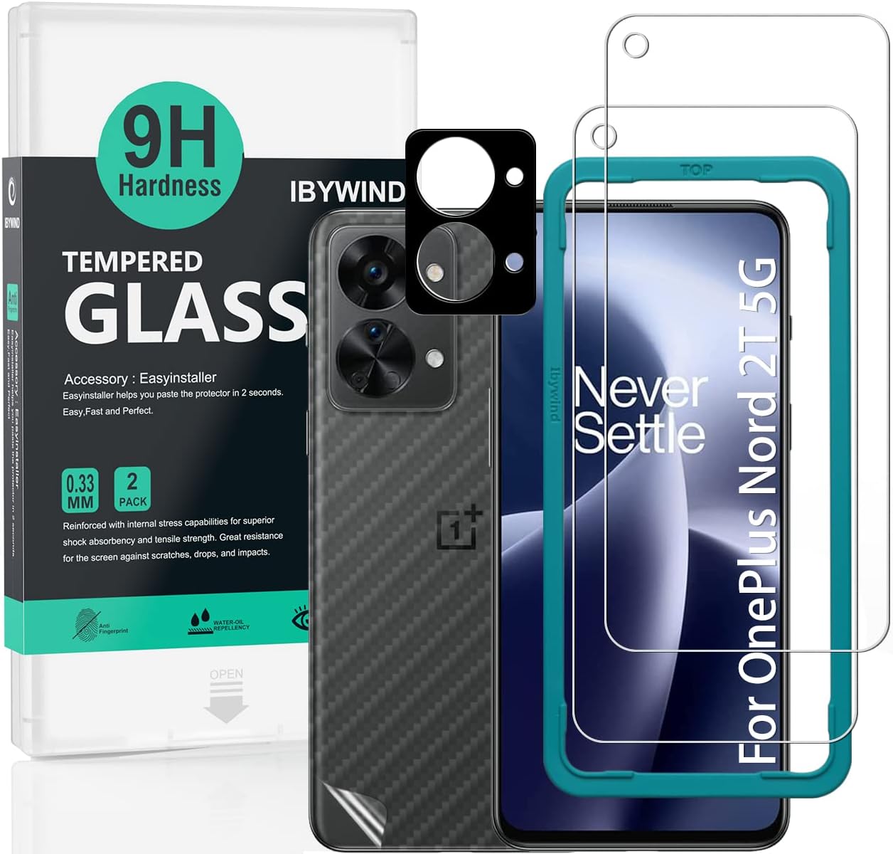 IBYWIND Screen Protector For Oneplus Nord 2T 5G(6.43 Inches),with 2Pcs Tempered Glass,1Pc Camera Lens Protector,1Pc Backing Carbon Fiber Film[Fingerprint Reader,Easy to install]