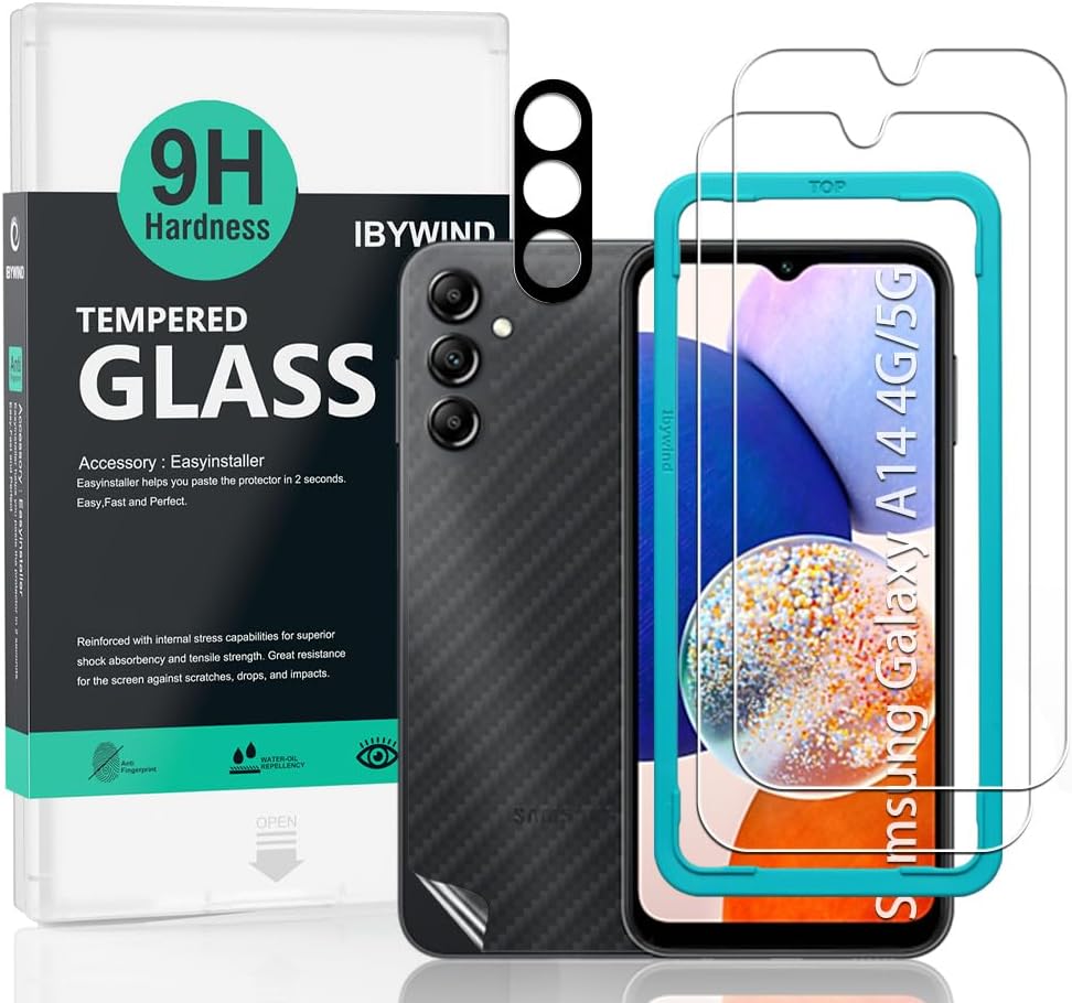 IBYWIND Screen Protector For Samsung Galaxy A14 5G/Galaxy A14 4G(6.6"),with 2Pcs Tempered Glass,1Pc Camera Len Protector,1Pc Backing Carbon Fiber Film[Fingerprint Reader,Easy to install]