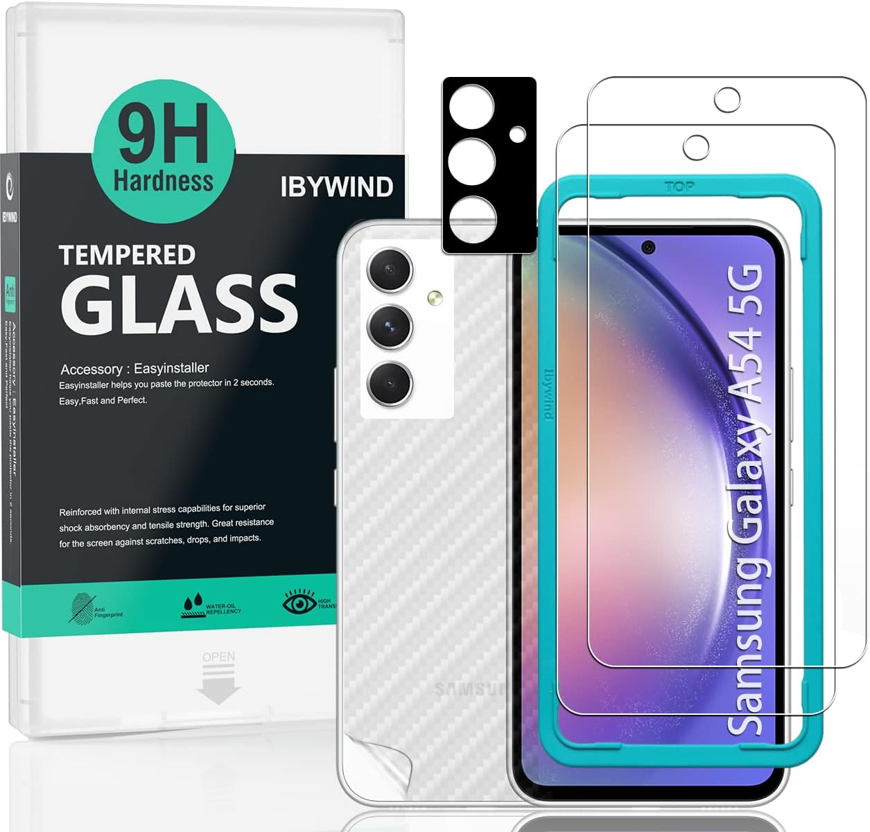 IBYWIND Screen Protector For Samsung Galaxy A54 5G(6.4"),with 2Pcs Tempered Glass,1Pc Camera Len Protector,1Pc Backing Carbon Fiber Film[Fingerprint Reader,Easy to install]