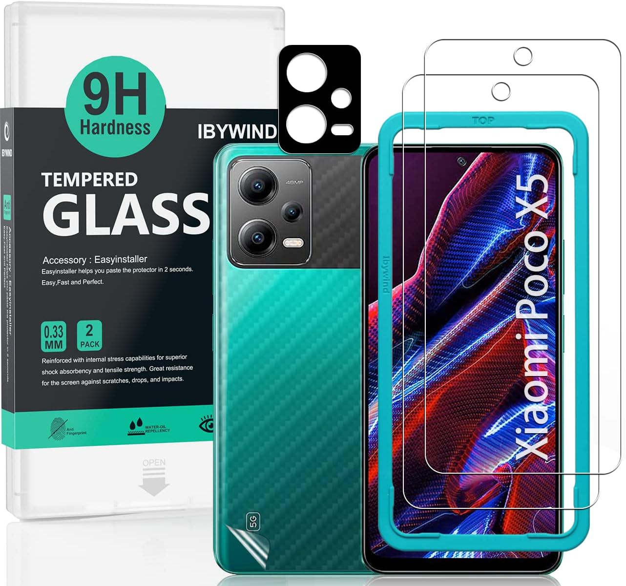 IBYWIND Screen Protector For Xiaomi Poco X5 5G(6.67"),with 2Pcs Tempered Glass,1Pc Camera Len Protector,1Pc Backing Carbon Fiber Film[Fingerprint Reader,Easy to install]