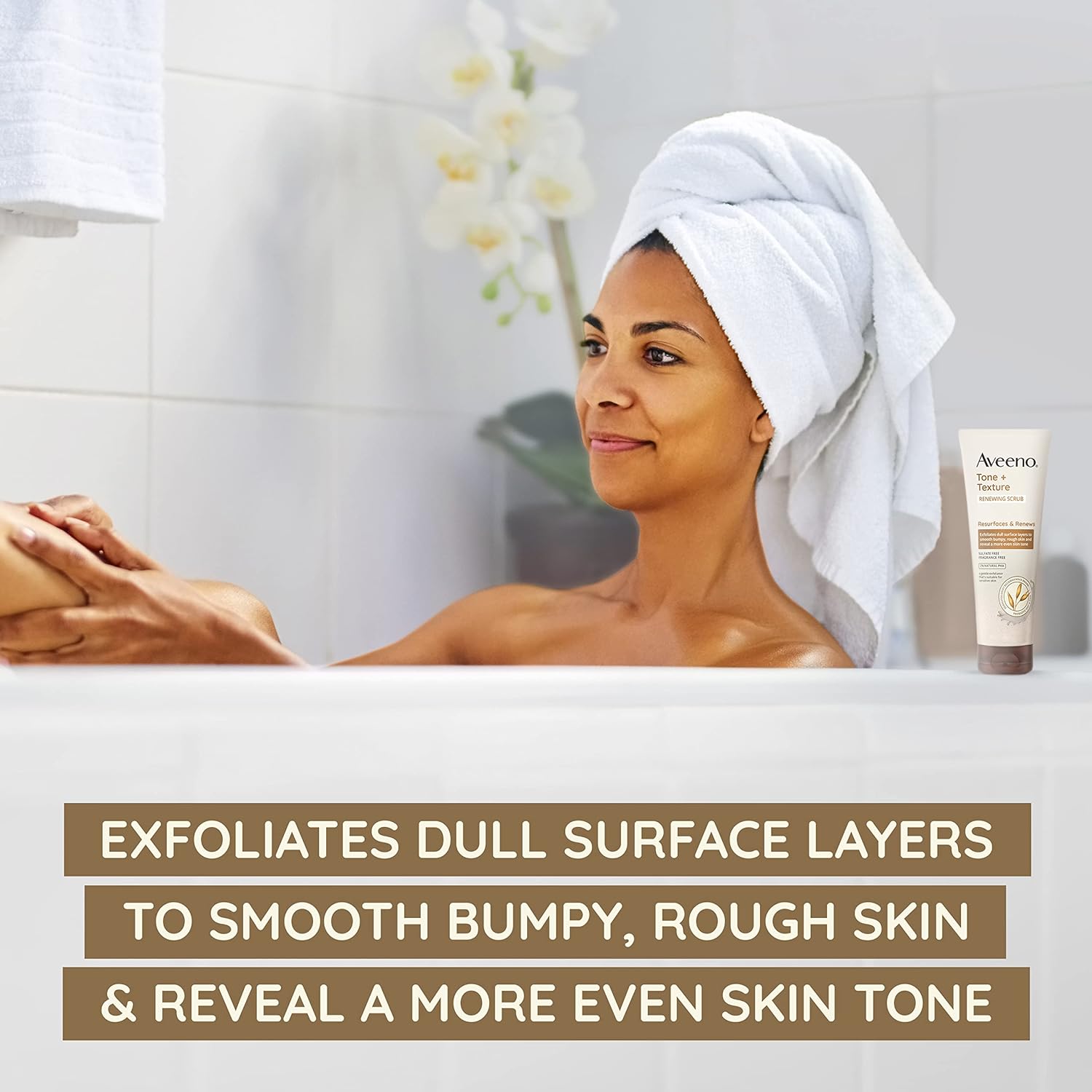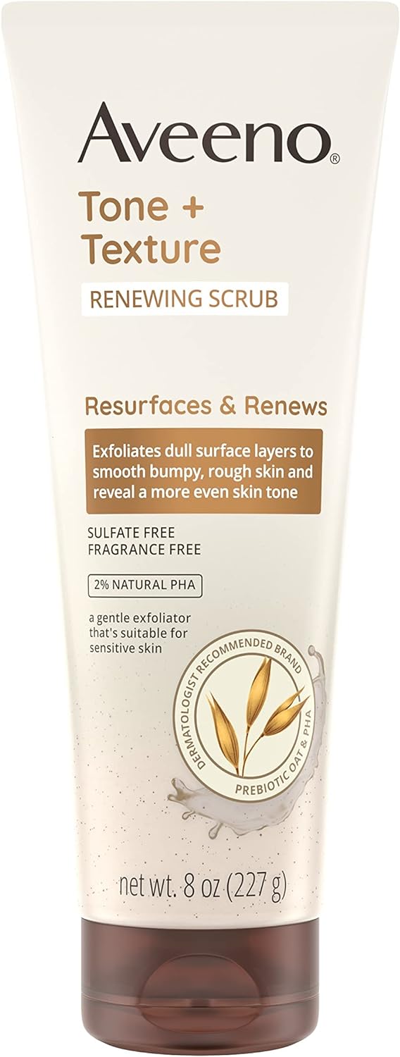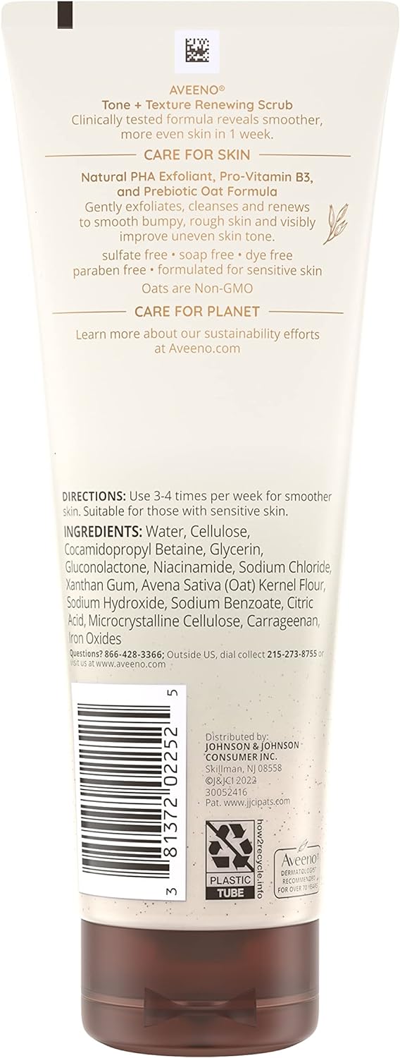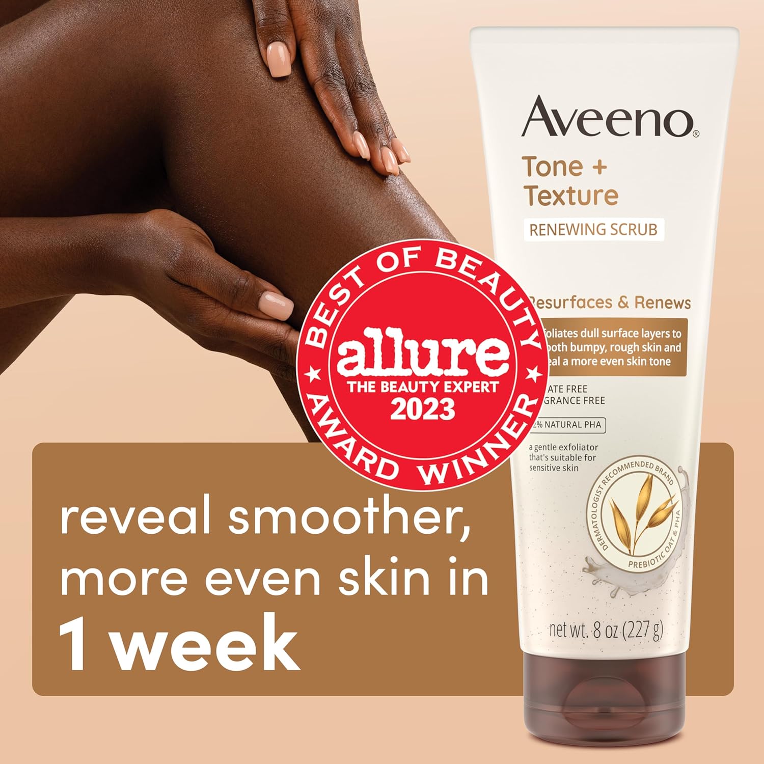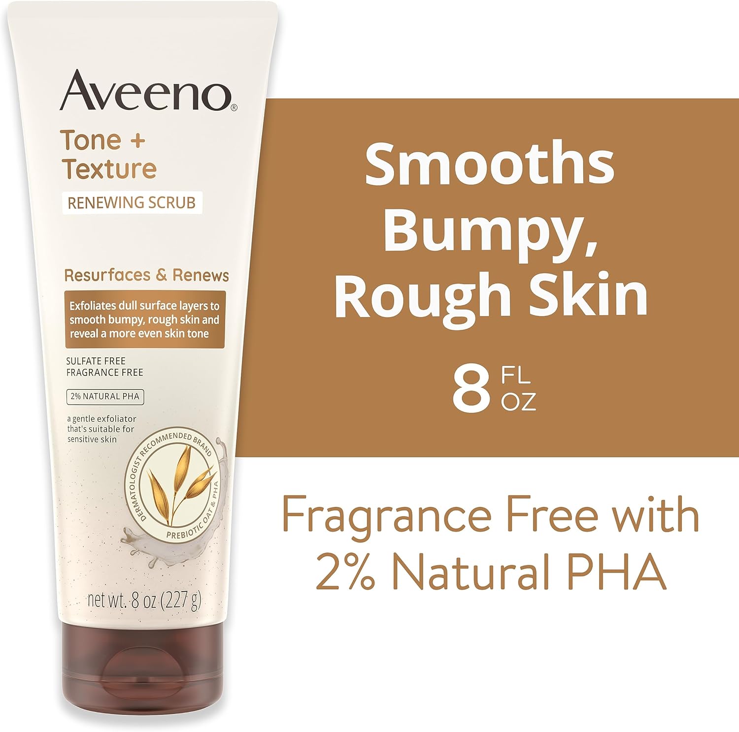 8-ounce tube of Aveeno Tone + Texture Renewing Body Scrub gently exfoliates dull surface layers to smooth bumpy, rough skin and reveal a more even skin tone in just one week