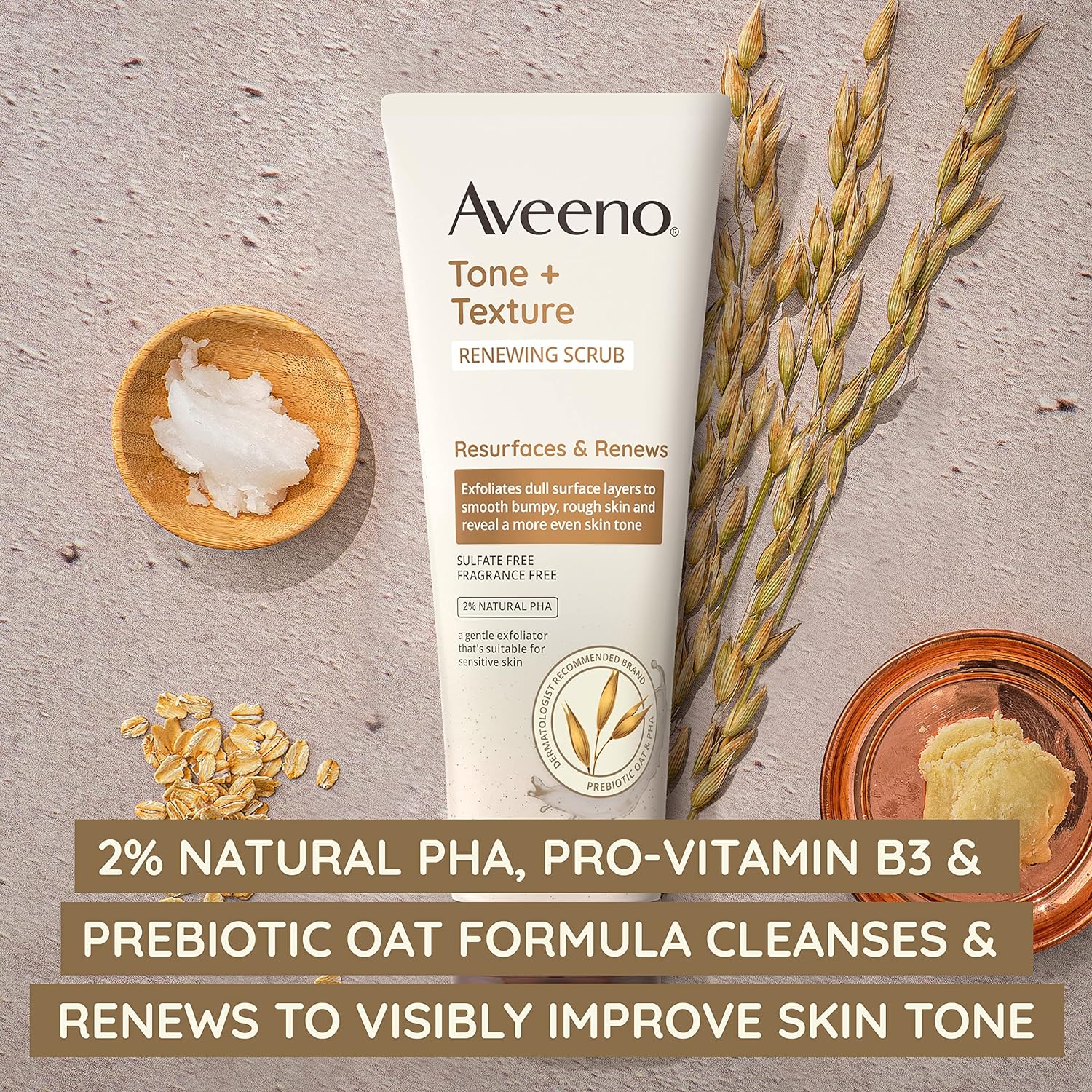 Aveeno Tone + Texture Renewing Body Scrub, Exfoliating Body Wash to Reveal Smoother Skin and a More Even Skin Tone, Prebiotic Oat Formula for Sensitive Skin, Fragrance-Free, 8 oz