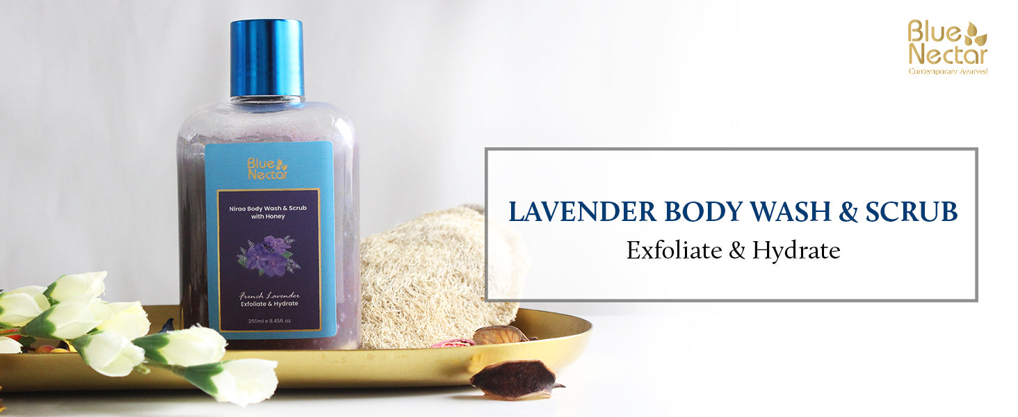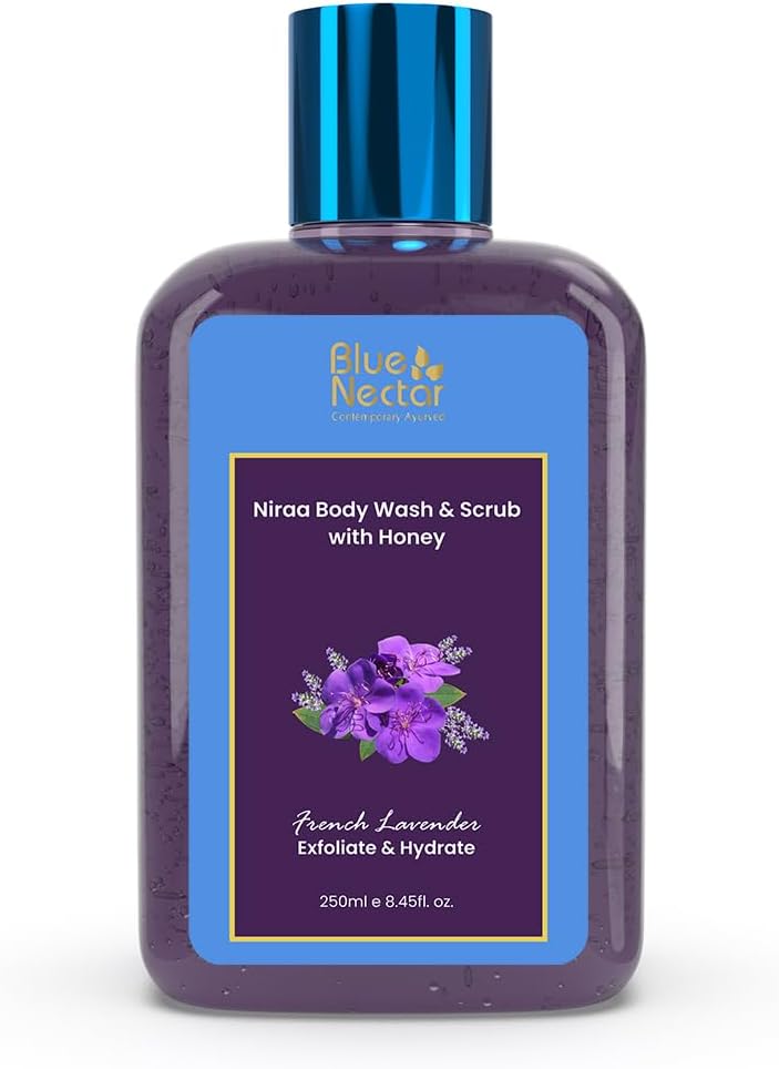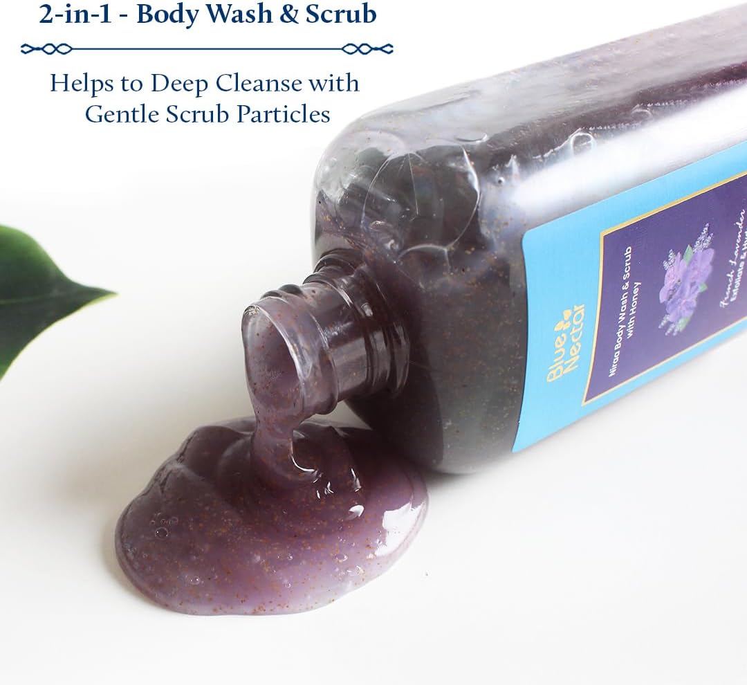 Blue Nectar Exfoliating Body Wash & Scrub for Rough & Bumpy Skin | French Lavender Tan Removal Body Scrub for Women & Men (10 herbs, 250ml)