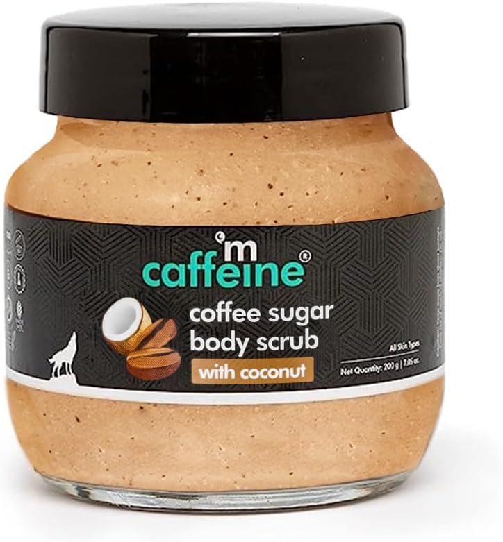 mCaffeine Coffee Body Scrub with Sugar & Coconut for Gentle Exfoliation & Smoothening | Reduces Dead Skin, Tan & Scars | Even Toned Skin with Coconut Aroma | Ultra Fine Scrub for Men & Women - 250g