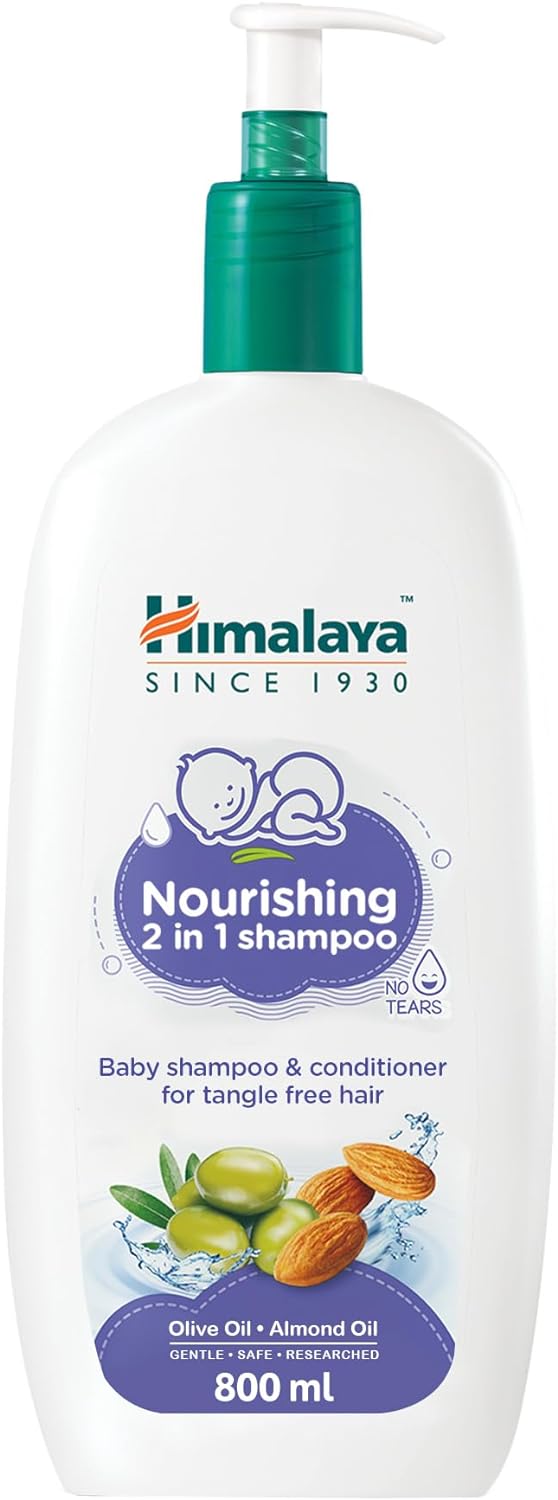 Himalaya Baby 2-in-1 daily nourishing baby shampoo and conditioner with natural olive and almond oil gently cleanses and conditions hair and scalp.