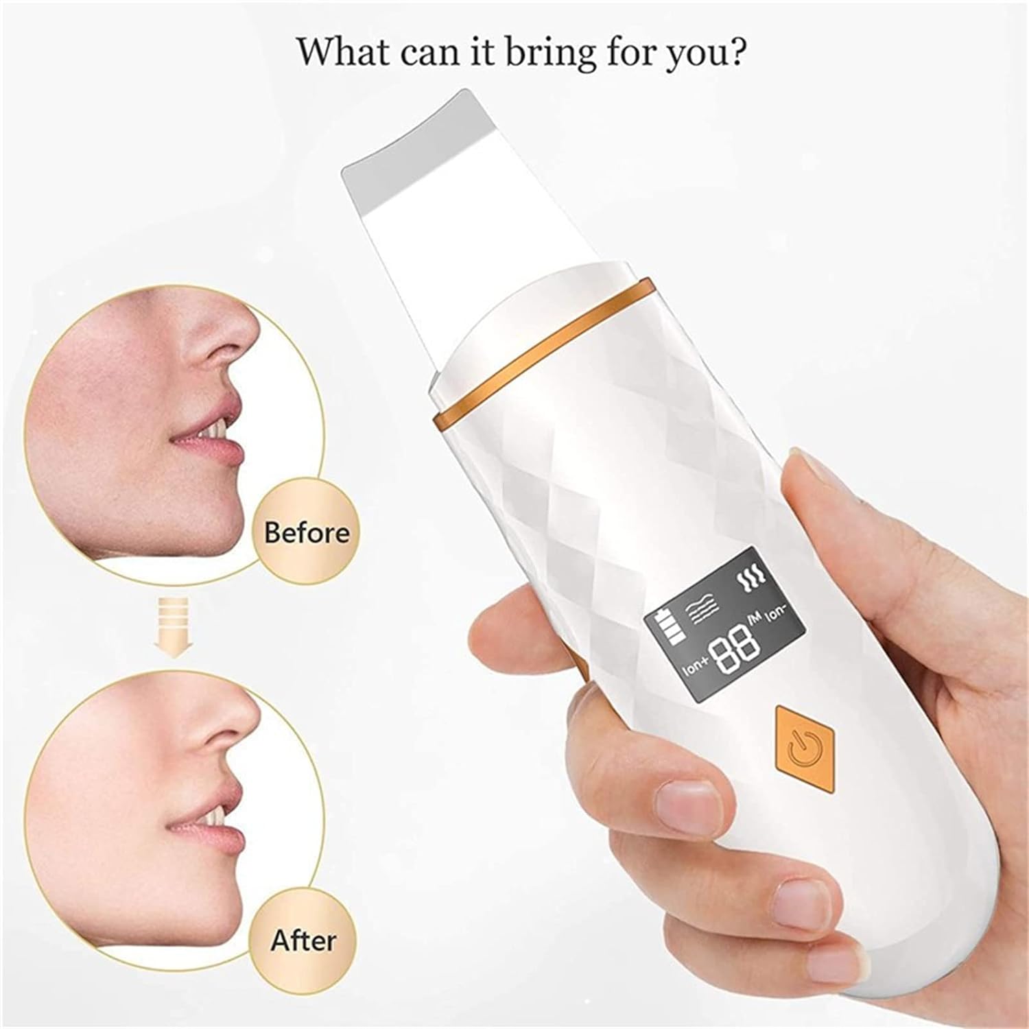 đăDelicate DesignăFace scraper care dual vibrating stainless steel blade and 15MM spade with 3D curves which ensures the blade could reach every angle of your skin; Dust-proof soft silicone cover to protect the shovel head; One button to switch between three modes; Timing function Automatic shutdown in five minutes to prevent overuse.