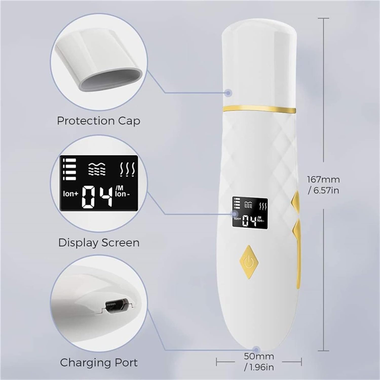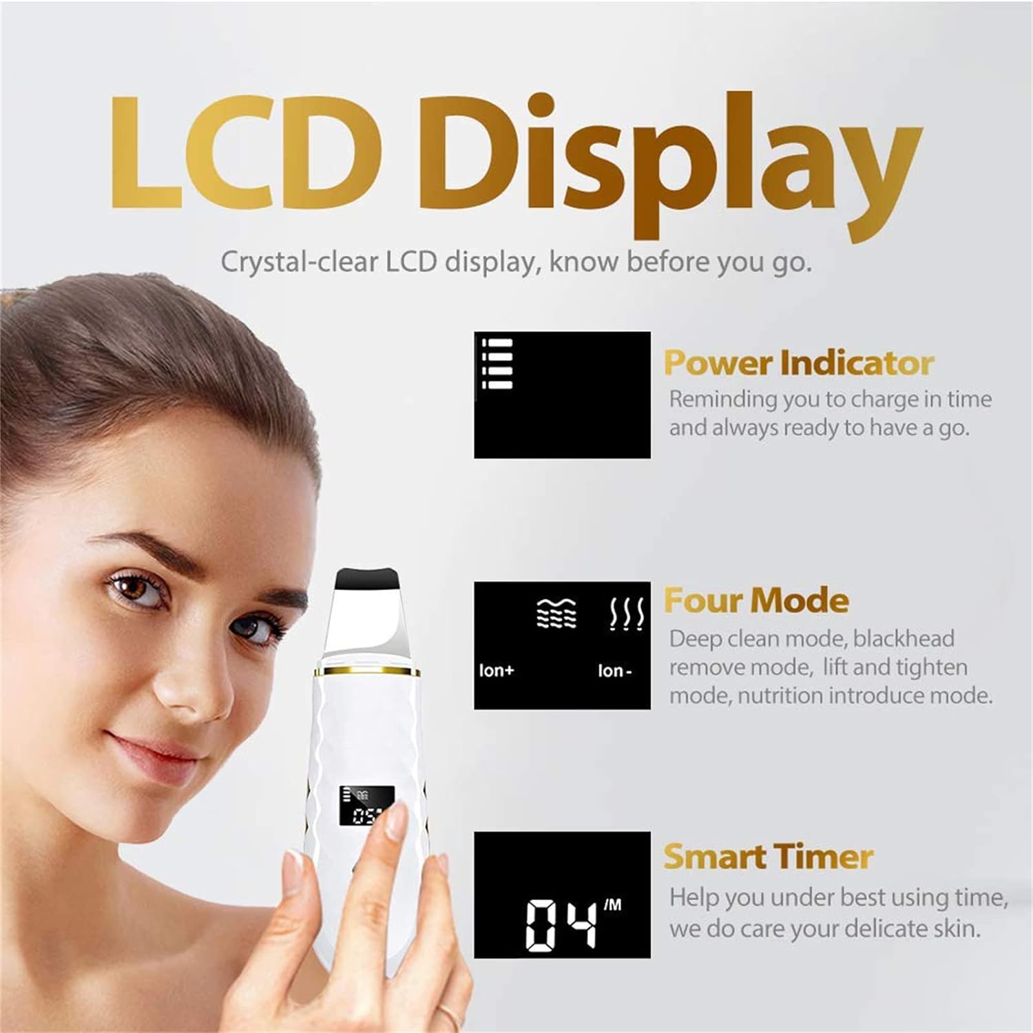 đă4 Adjustable ModesăFacial skin scrubber has four adjustable modes with LCD display function. Deep Clean: Clean your face with high frequency vibration, Ion+: Helps to remove the blackheads, dead skin, oil and dirt, Ion-: Help your face better absorb nutrition from skin care products, Massage: Help to reduce wrinkles or fine line, making your skin more tighten and bright.