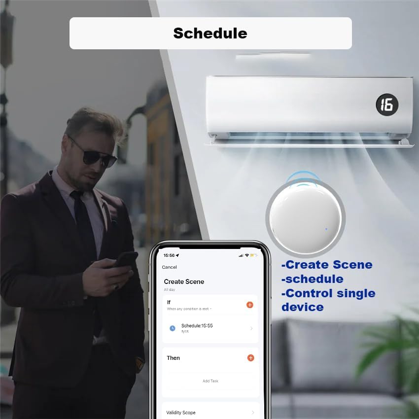 【Schedule】 Create Scene in the App, use schedule function to turn on/off your AC,TV automatically;Open the App-click scene-create scene-click schedule;