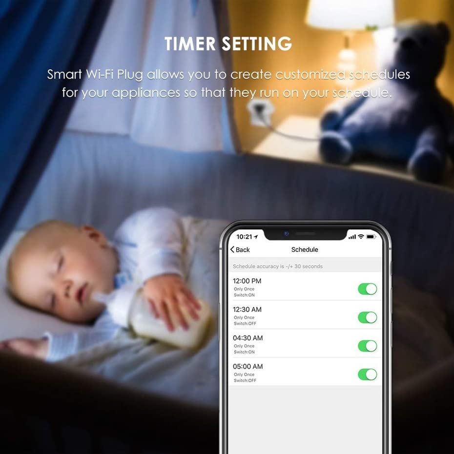 【SCHEDULES TIMING】With this feature, you can create schedules for connected electronics based on your daily routines. Turning on or off the appliances in scheduled time can also saves energy and time. Wake up with hot coffee or schedule the smart plug when to turn on your humidifier. A lot of convenience for you and your family.