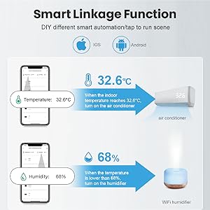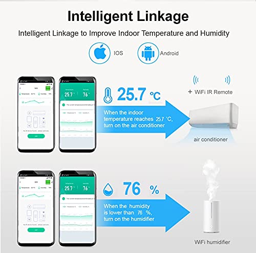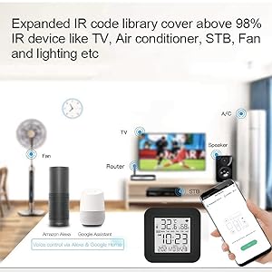 【Massive IR Code Database】: Support 4000+ brands, 50000+ IR Code on cloud, supported devices library is constantly being updated by the cloud,cover above 98% IR device like Air Condition,TV,STB,FAN,Light etc. Also it can linkage with smart home appliance like air condition,humidifier,dehumidifier ect.when temperature,humidity turn into abnormal condition set in the app. Home appliance can be actived automatically to keep your home in comfortable and stable environment.