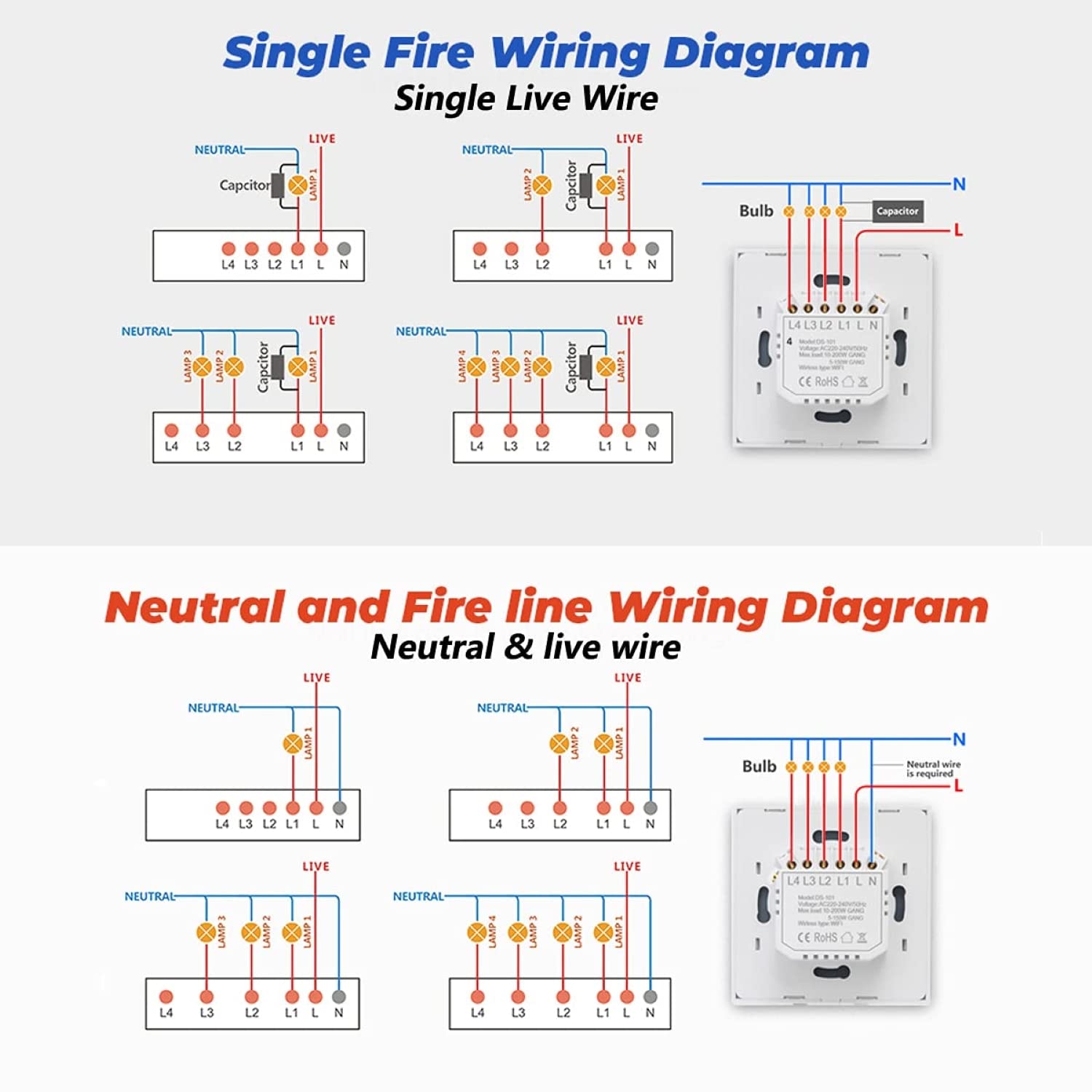 đăTwo Wiring Methodsă: Whether you have a neutral wire or not, this switch can meet your needs(Including capacitor).Sharing devices with your family members to eliminate extra steps for connection. Smart Scene :Creating your own scene to trigger ON/OFF home appliances by departure mode, home mode, temperature, humidity, or other environmental conditions.