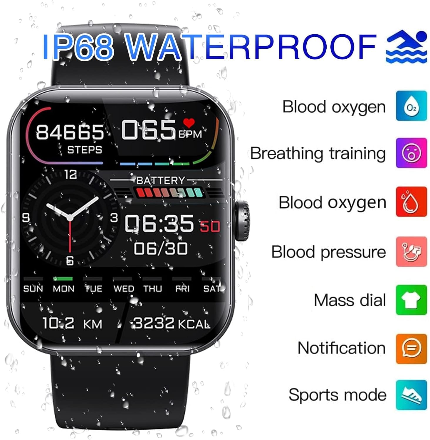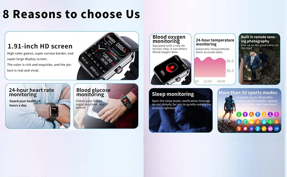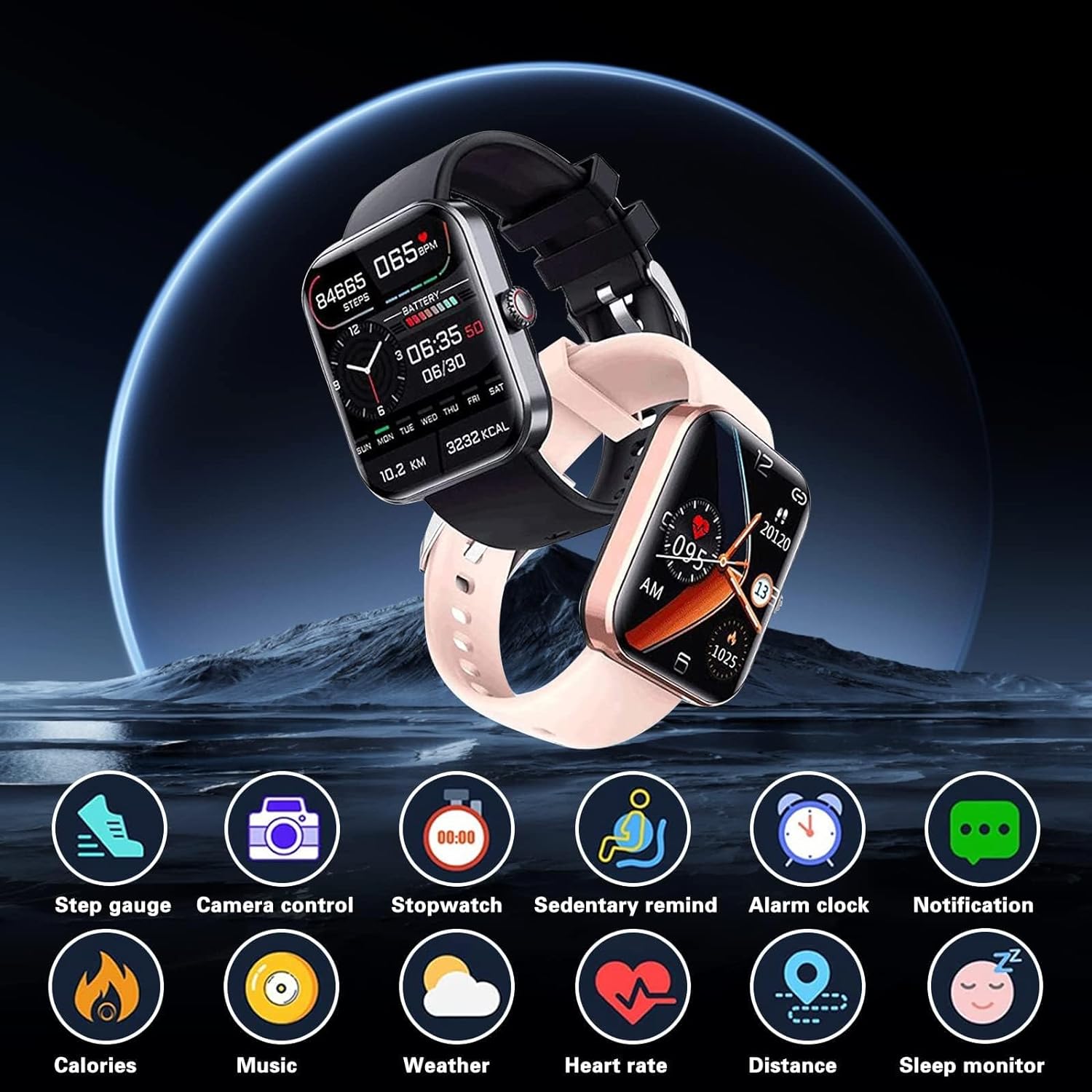 【More than just counting steps】 The smartwatch is a life assistant. Many valuable functions include blood oxygen, blood pressure, blood sugar, body temperature test, distance, calories, heart rate, sleep monitoring music playing, stopwatch,countdown, calculator, weather display, remote photography, wrist raising and screen lighting, alarm clocks, water drinking reminder, sedentary reminder, find your phone, customized watch face, etc.