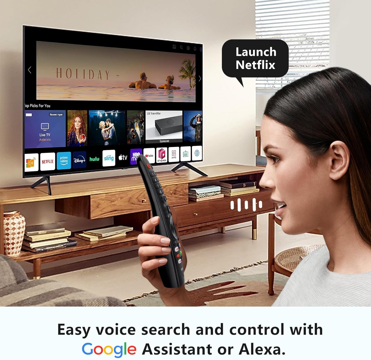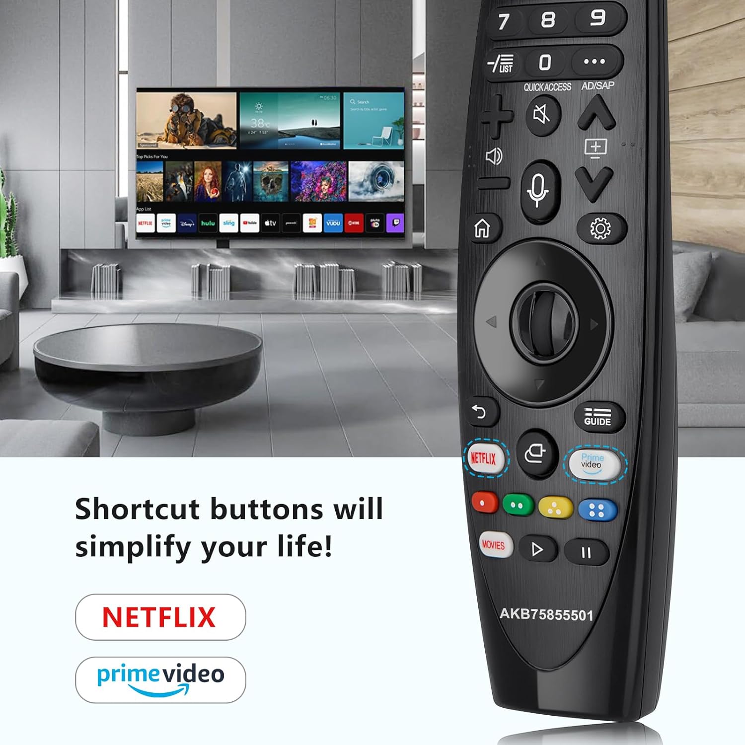 KEY FEATURES: Magic Vioce remote control makes interacting with for your LG smark TV easier! Intuitive Mouse Like Pointing and Wheel Control, and get to your favorite content quickly with preset app buttons for Netflix, Prime Video.