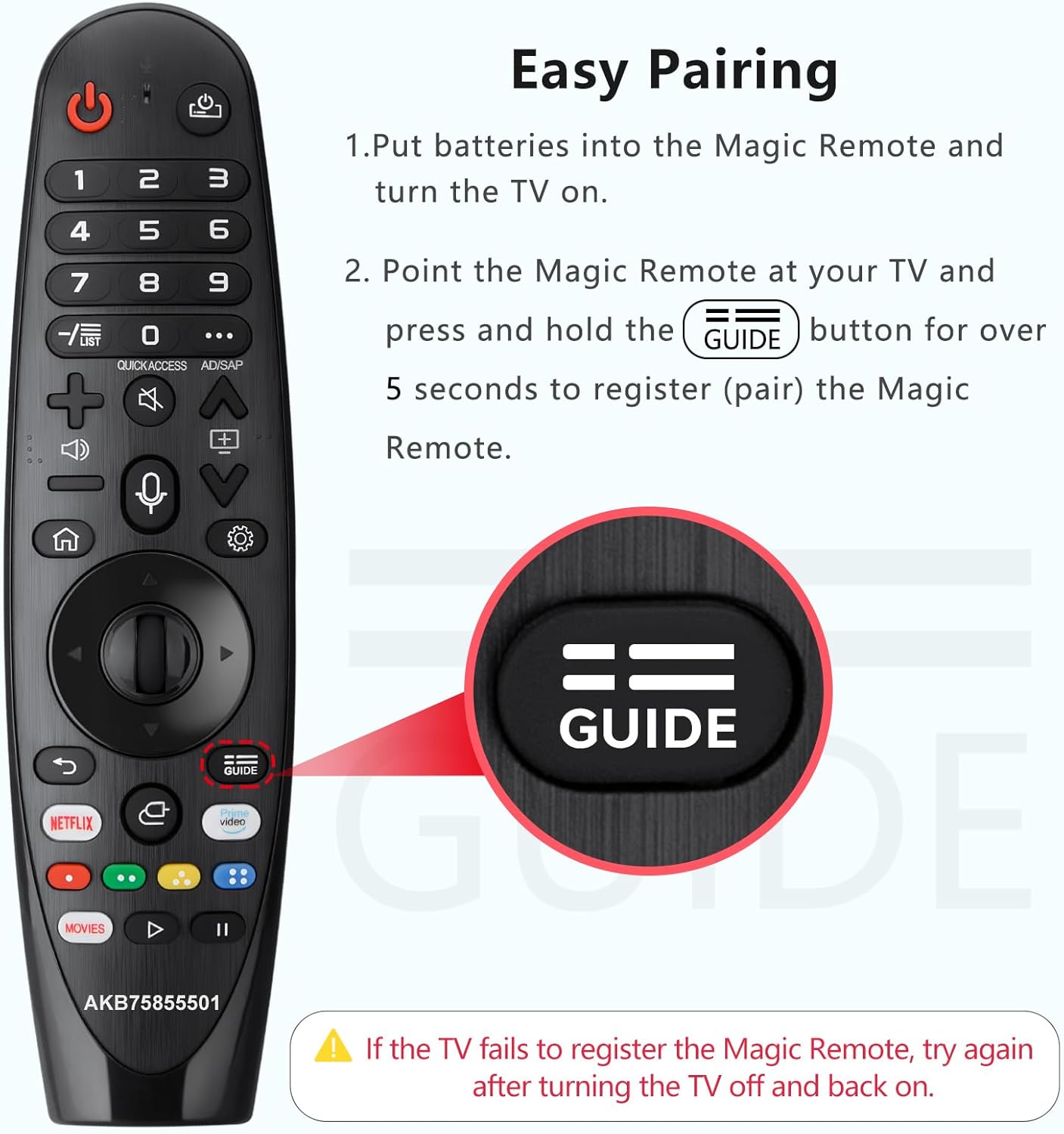 EASY PAIRING: ① Put batteries into the Magic Remote and turn the TV on. ② Point the Magic Remote at your TV and press the Wheel (OK) on the remote control. When the pointer is not working, press and hold the GUIDE button button for more than 5 seconds to disconnect and re-register the motion sensor remote control at the same time. (Using a new magic remote control, or a magic remote control for another TV, this pairing process is required before use)