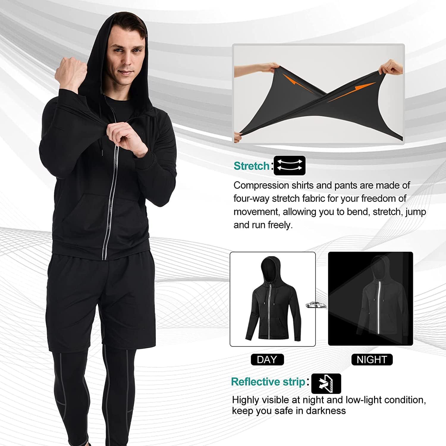Moonmen 5pcs Mens Sports Gym Fitness Running Clothing Set, Hoodies Jackets, Long Short Sleeve, Basic T Shirts, Loose Fitting Shorts, Compression Pants Workout Training Tracksuits