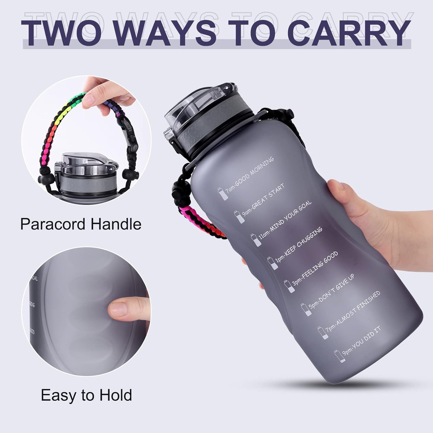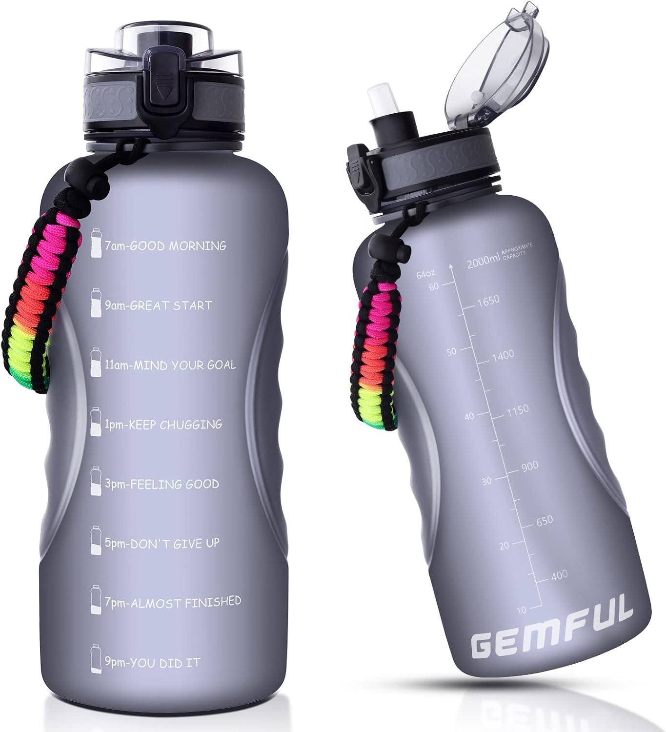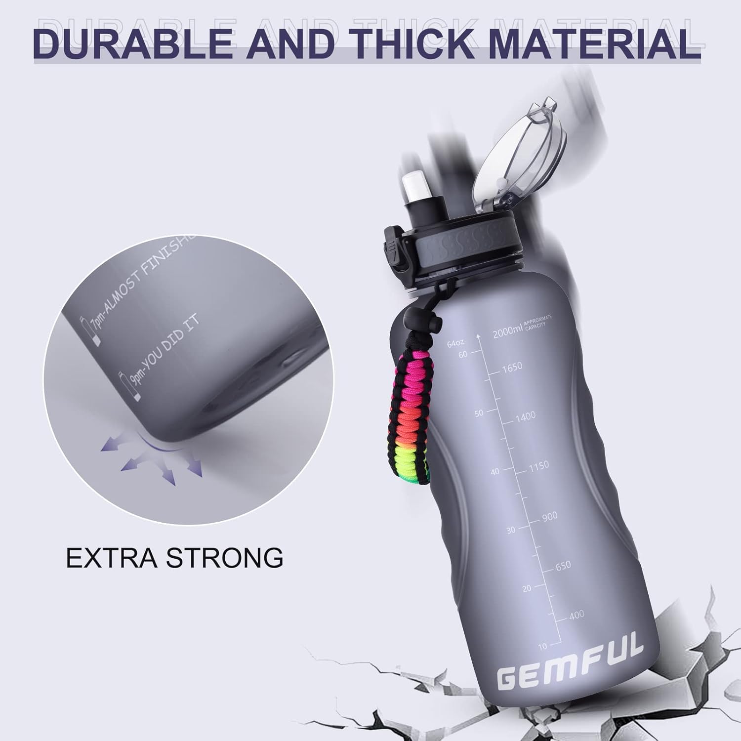 Upgraded Designs & Portable - The GEMFUL 2l water bottle with removable straw is designed with a food grade silicone O-ring ensure 100% LEAKPROOF. The spring-loaded dust cap can effectively prevent dust from entering to your bottle. With a durable paracord HANDLE design and ANTI-SKID grip this 1/2 gallon water bottle makes you carry it to anywhere easier