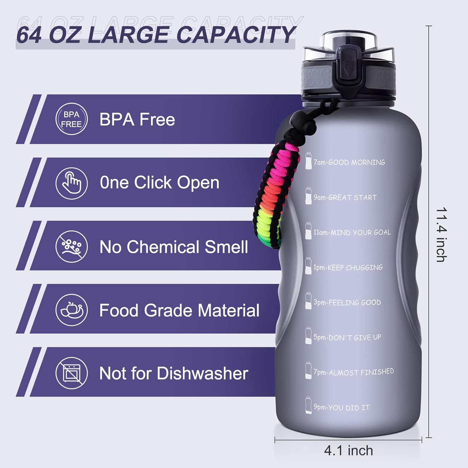 Half Gallon Big Size - LARGE 64 OZ capacity ensures you enjoy one full water bottle without having to refill it frequently. Perfect for gym, workout, office and any outdoor recreations