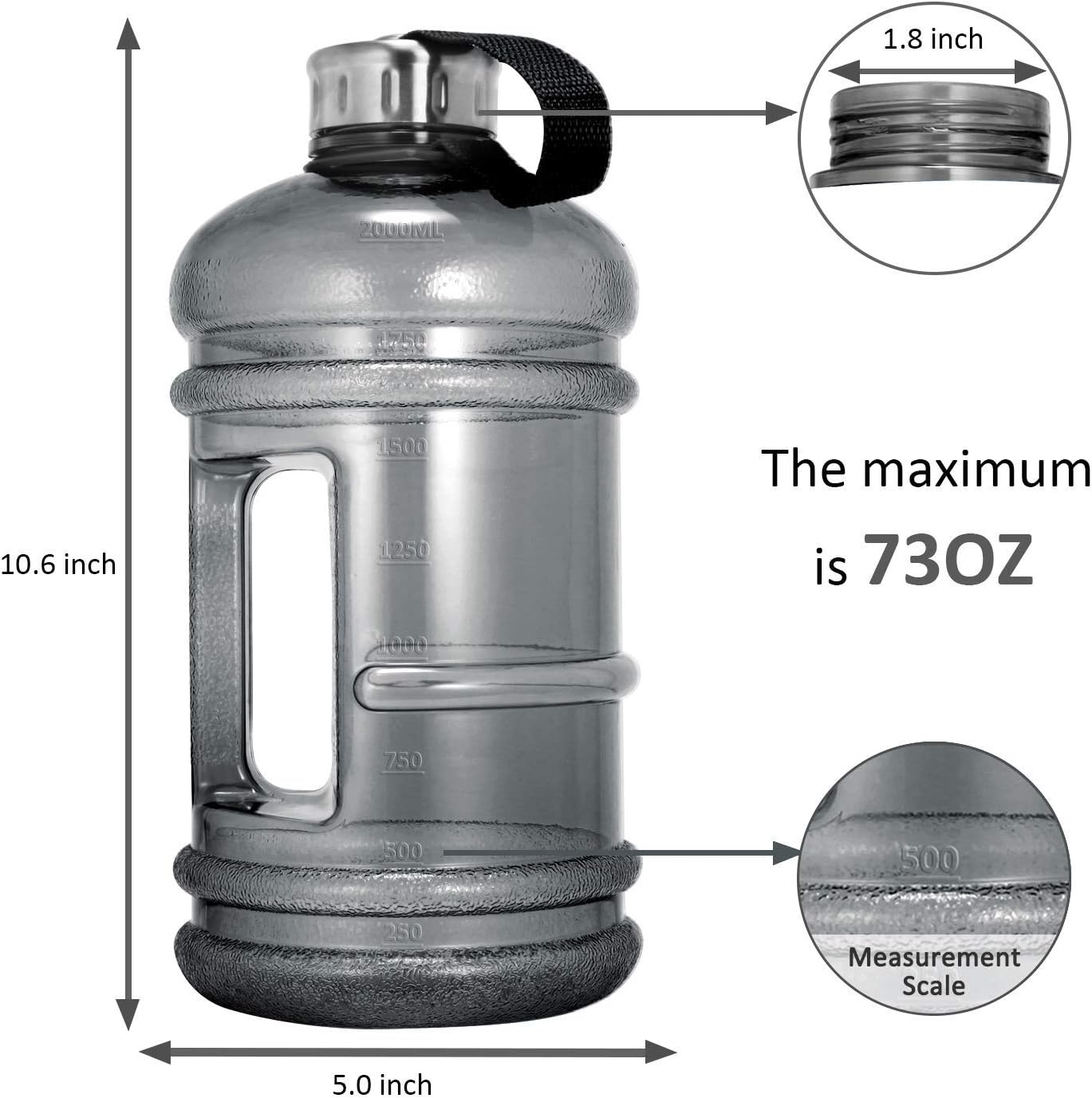 LARGE CAPACITY: The 2.2l large capacity water bottle could meet your needs for more water intake, great for your daily basis. 2.2 liters fit inside the bottle. This corresponds to daily water intake. Transparent outlook, easy to check how much water you need to hold and how much water you have got. Perfect for pre or after workout water needs.