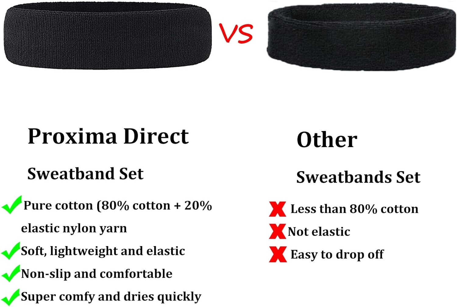 Comfortable sweatbands set: Proxima Direct Sweatband Set including 3 piece of sweat headband, which made of high quality material, which is soft, lightweight and elastic for comfortable wearing.And it is super comfy and dries quickly.
