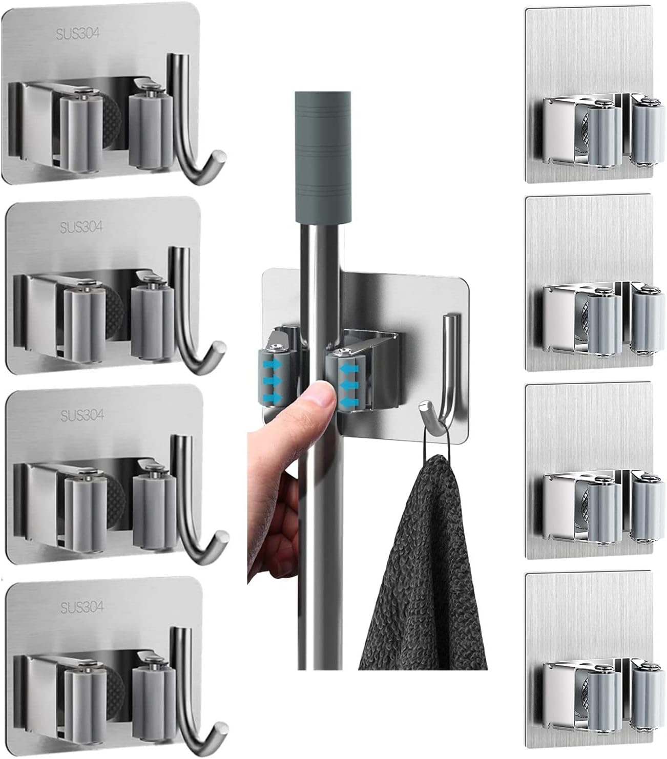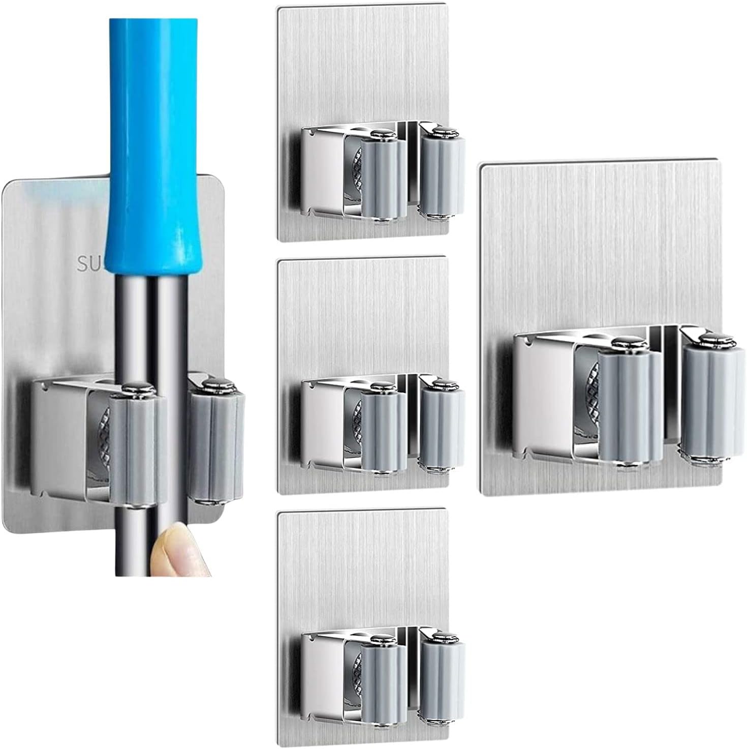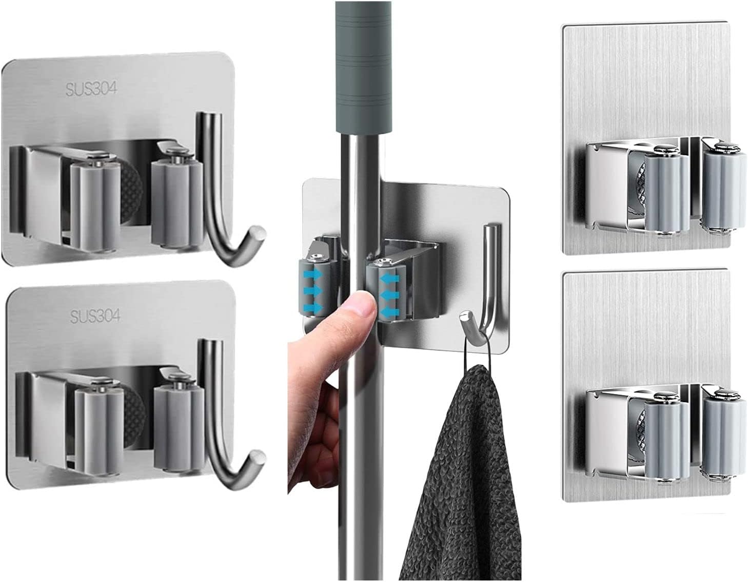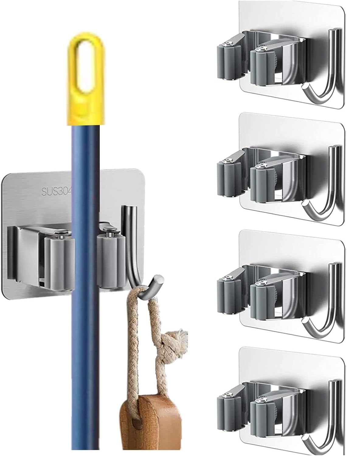 ZALCOON 4 PCS Mop Broom Holder Wall Mount - Mop Holder Self Adhesive Broom Hanger Stainless Steel for Home Garage Garden Laundry Room Storage, Kitchen Tools Organizer (With Hook)