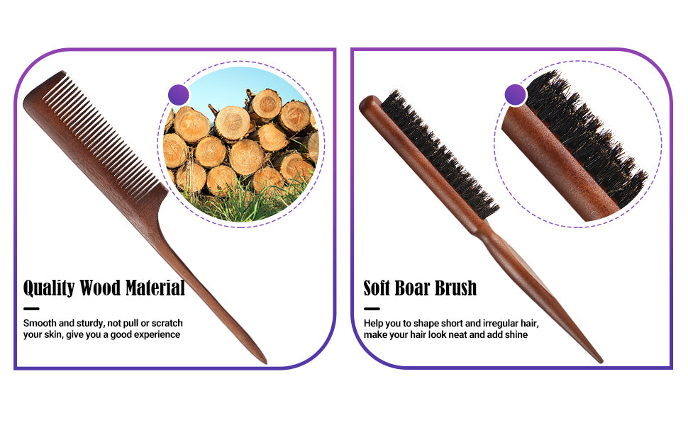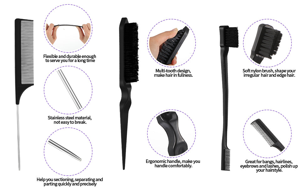 Complete Hair Kit: Get 3 essential tools in one package: a 6.9-inch double-sided edge brush, an 8.78-inch bristle brush, and an 8.78-inch pin tail comb. Perfect for edges, baby hair, and fine hair.