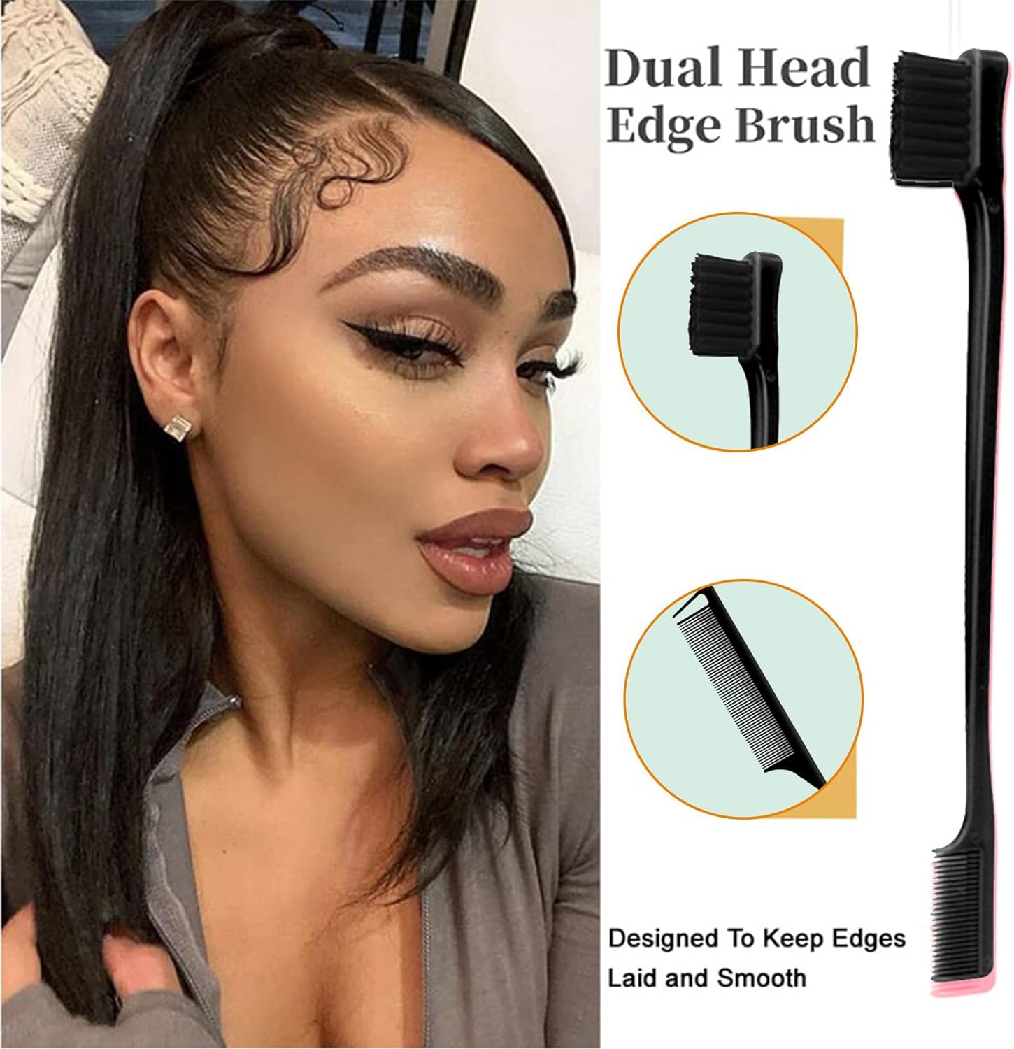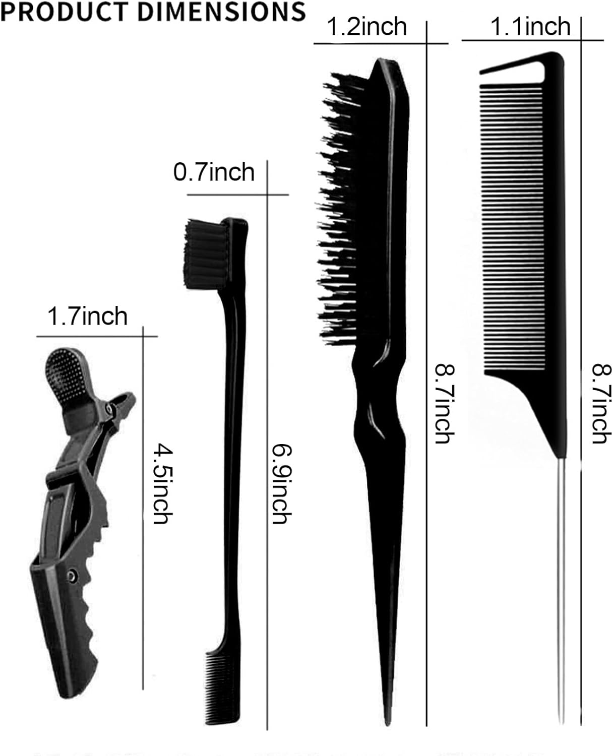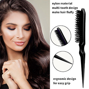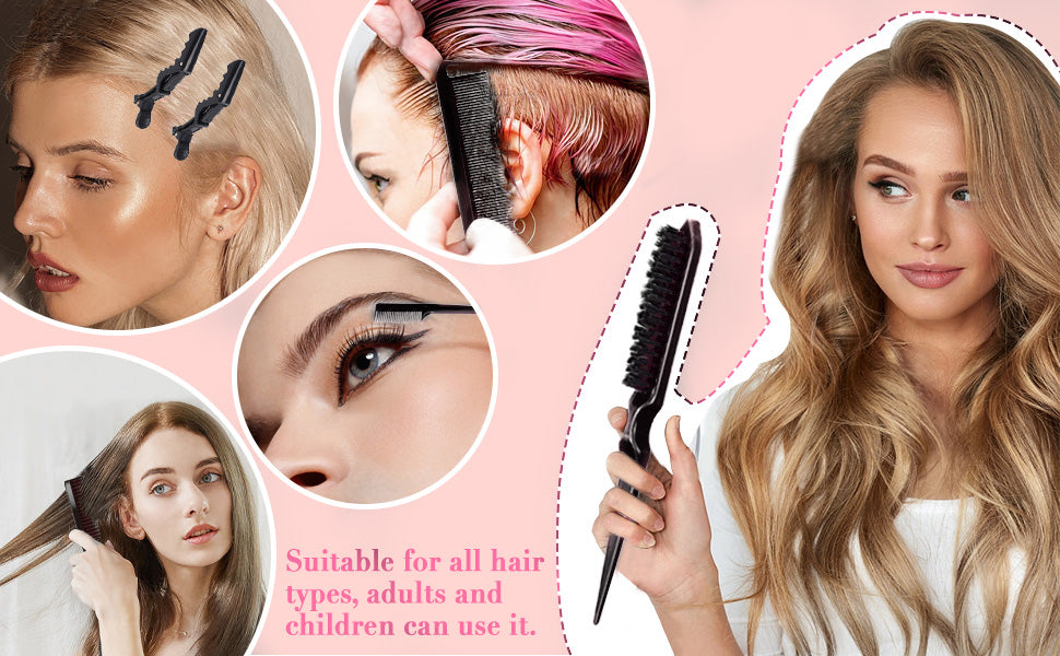 【 Teasing Brushes Set for Hair Care 】5 pieces of hair control tools, including 6.9 inches double-sided hair edge brush, 8.7 inches 3 row salon bristle brushes, 8.7 inches pin tail comb and 2pcs 4.5 inches alligator clips.