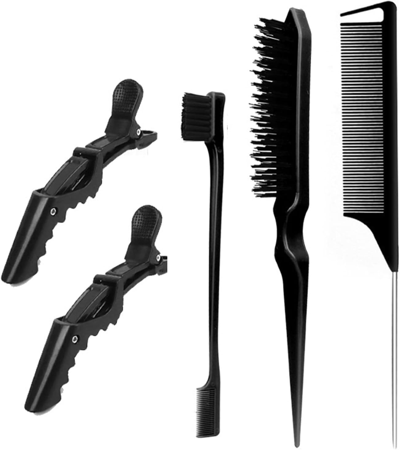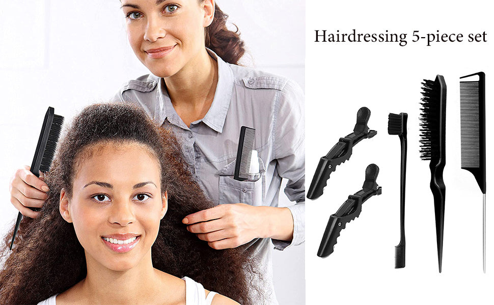Hair Styling Comb Set - Edges Control Brush, Teasing Bristle Brush, Rat Tail Comb, 2pcs Alligator Clips for Back Brushing Slicking Combing - Women Girls Stylists Baby Beauty Accessories(5pcs)