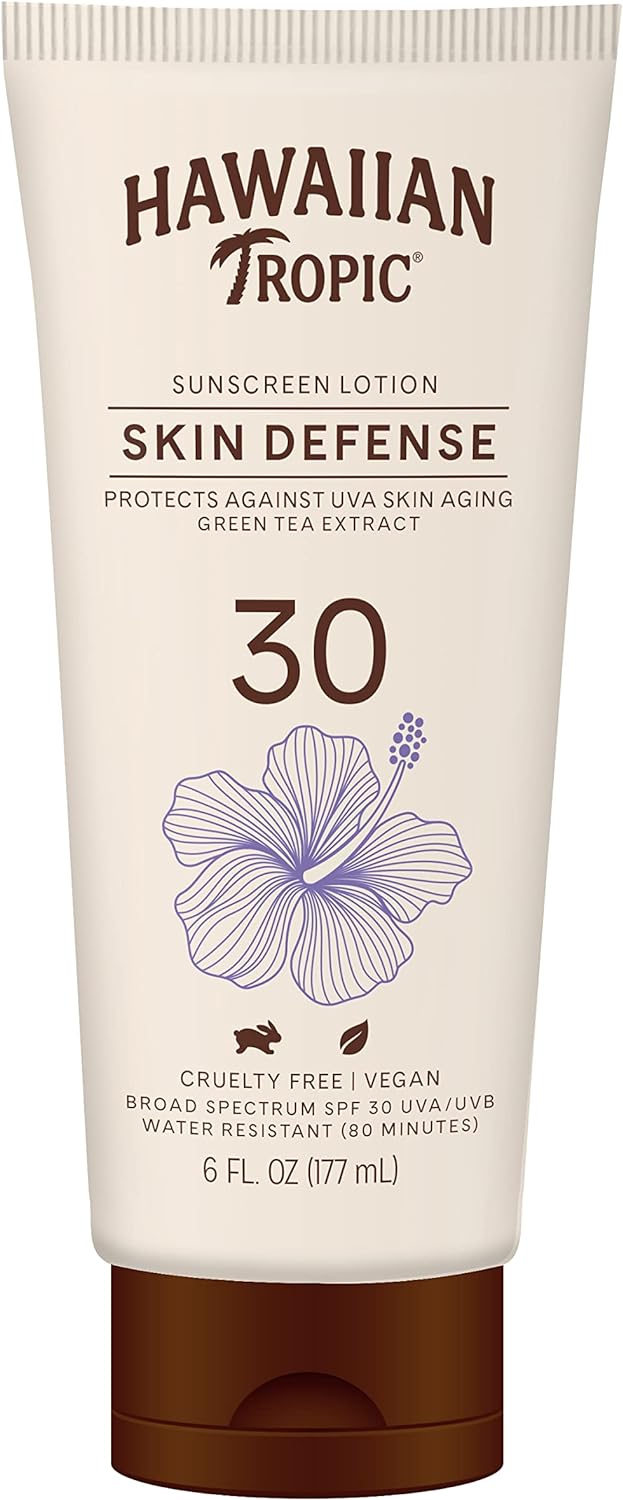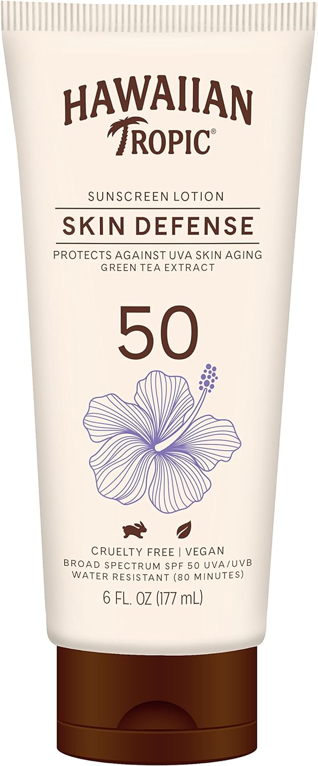 Hawaiian Tropic Sunscreen Lotion Skin Defense, Protect against UVA Skin Aging Green tea extract, SPF 50 UVA/UVB Vegan Water resistant(80 mins), Oil Free, Derm Tested, No Oxybenzone, Lightweight- 177ml