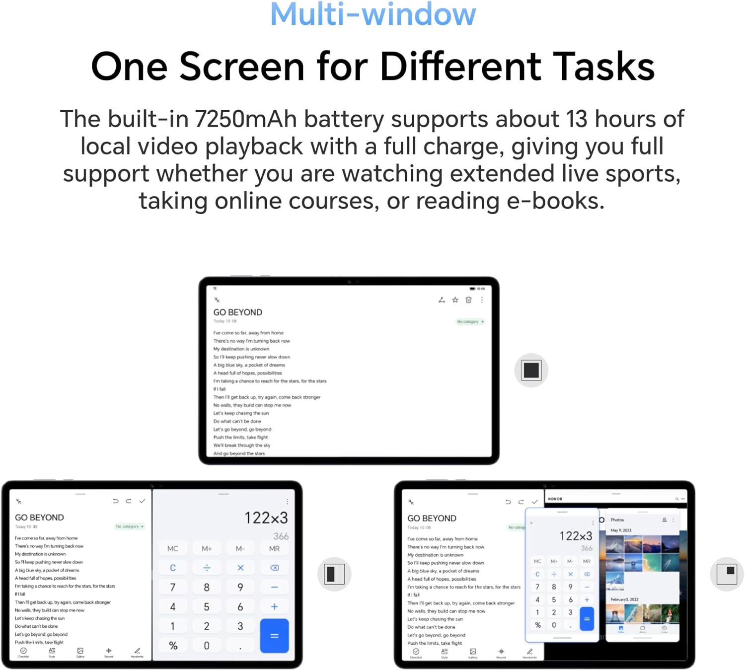 Extra Power:The built-in 7250mAh battery supports about 13 hours of local video playback with a full charge, giving you full support whether you are watching extended live sports, taking online courses, or reading e-books