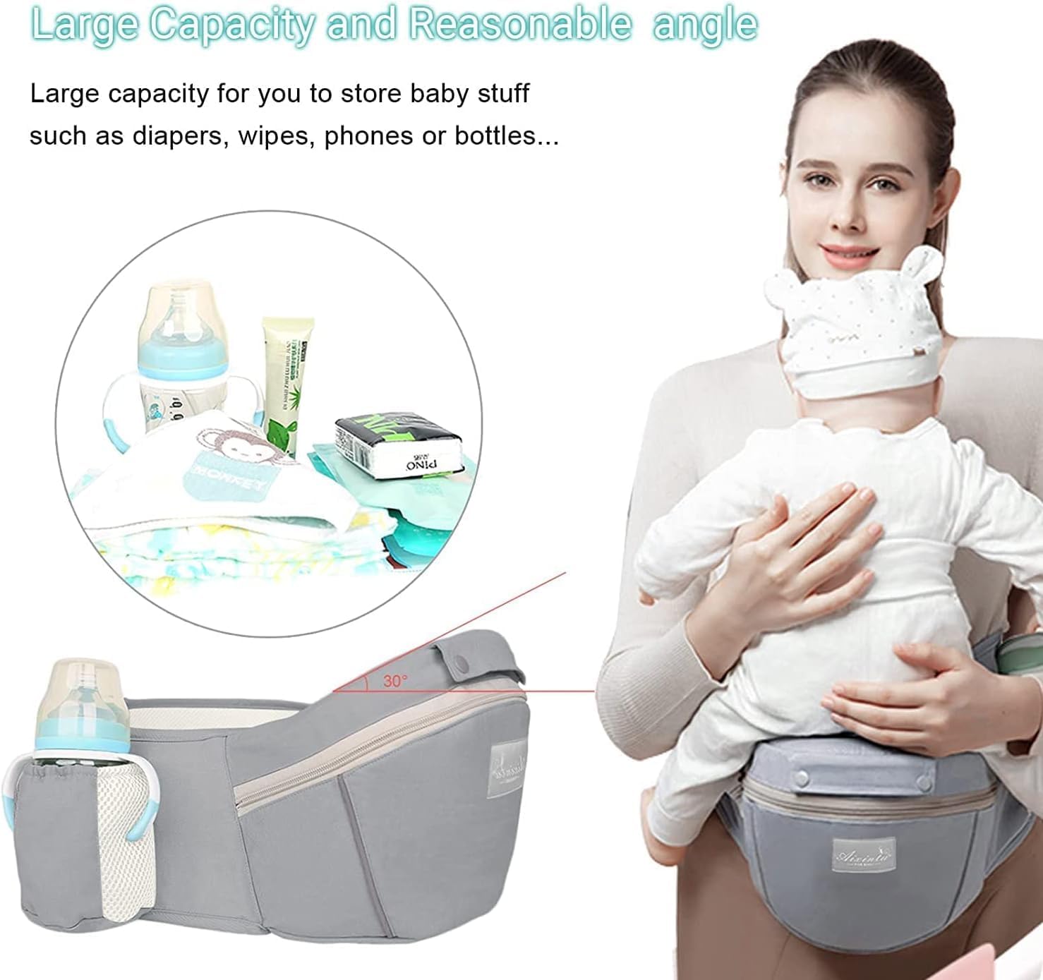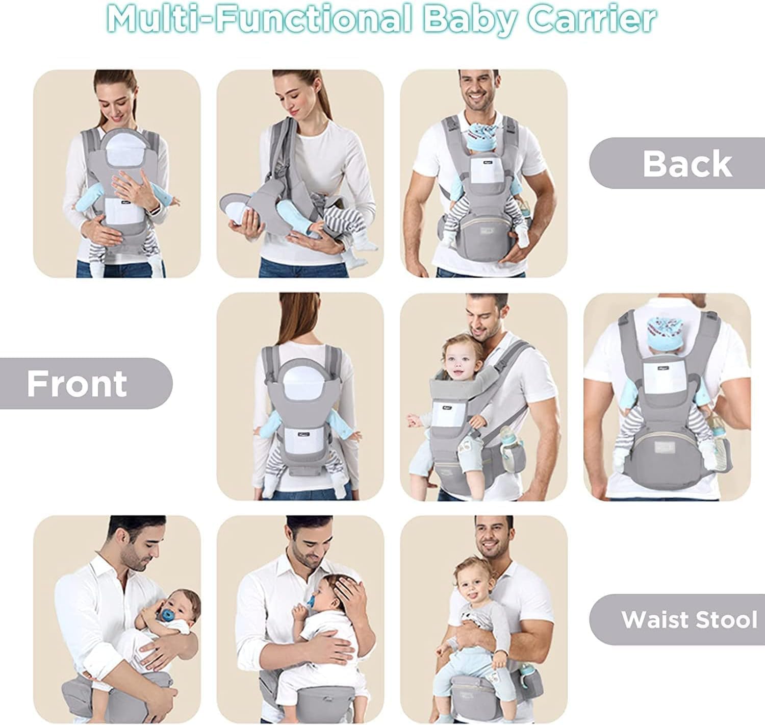 ✅ MULTIFUNCTION BABY CARRIER: The baby carrier is a versatile accessory that offers multiple functions to accommodate the varying needs of parents and their babies. It is detached and used as a whole baby carrier backpack with a hip seat, or it can be used separately as a waist stool or baby carrier wrap depending on the baby's stage of development. The adjustable waist stool fits waist circumferences of 26-40 inches, providing a secure and comfortable fit for the wearer.