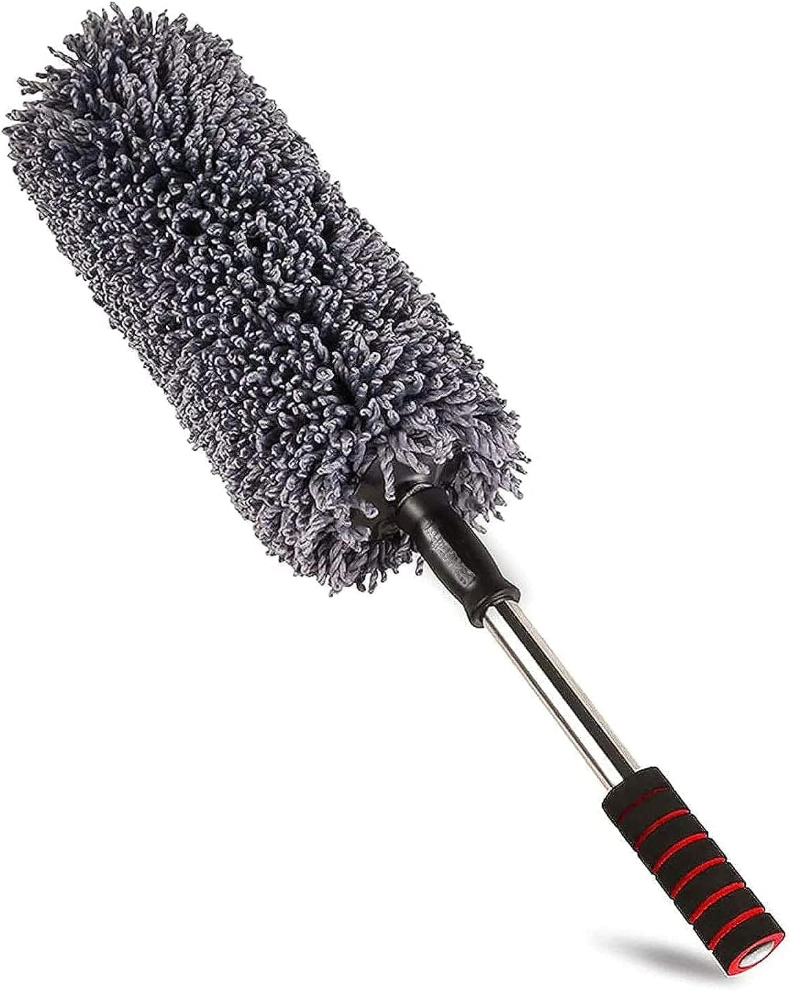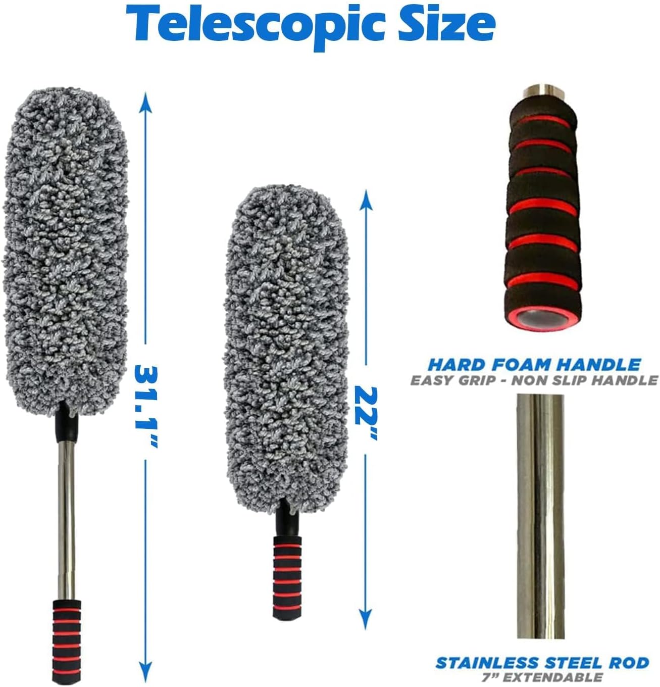 🚗 BEST HANDLE DESIGN - Our car dust brush with telescopic handle and non-slip grip design, is convenient and safe, Retractable from 22“ to 31”. Made from high quality stainless steel telescopic rod, easy to extend and close. Extendable handle allows for easy access in hard to reach areas .so you only need to stretch the bar to reach high and far areas.
