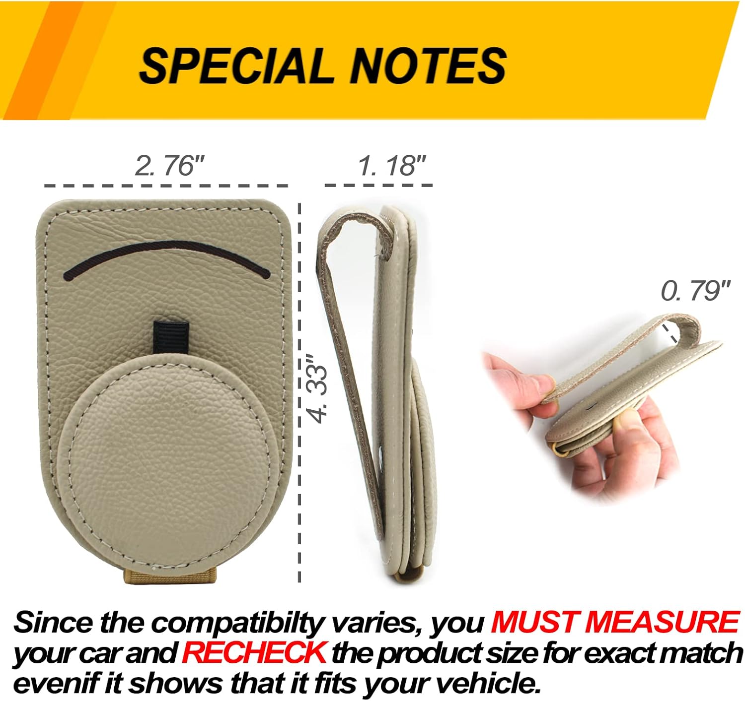 • Sunglass Holder for Car Visor: Glasses holder clip fits most vehicles whose thickness of sun visor does not exceed 0.79 inch. You must measure the visor and recheck the size for exact match evenif it shows that it fits your vehicle.