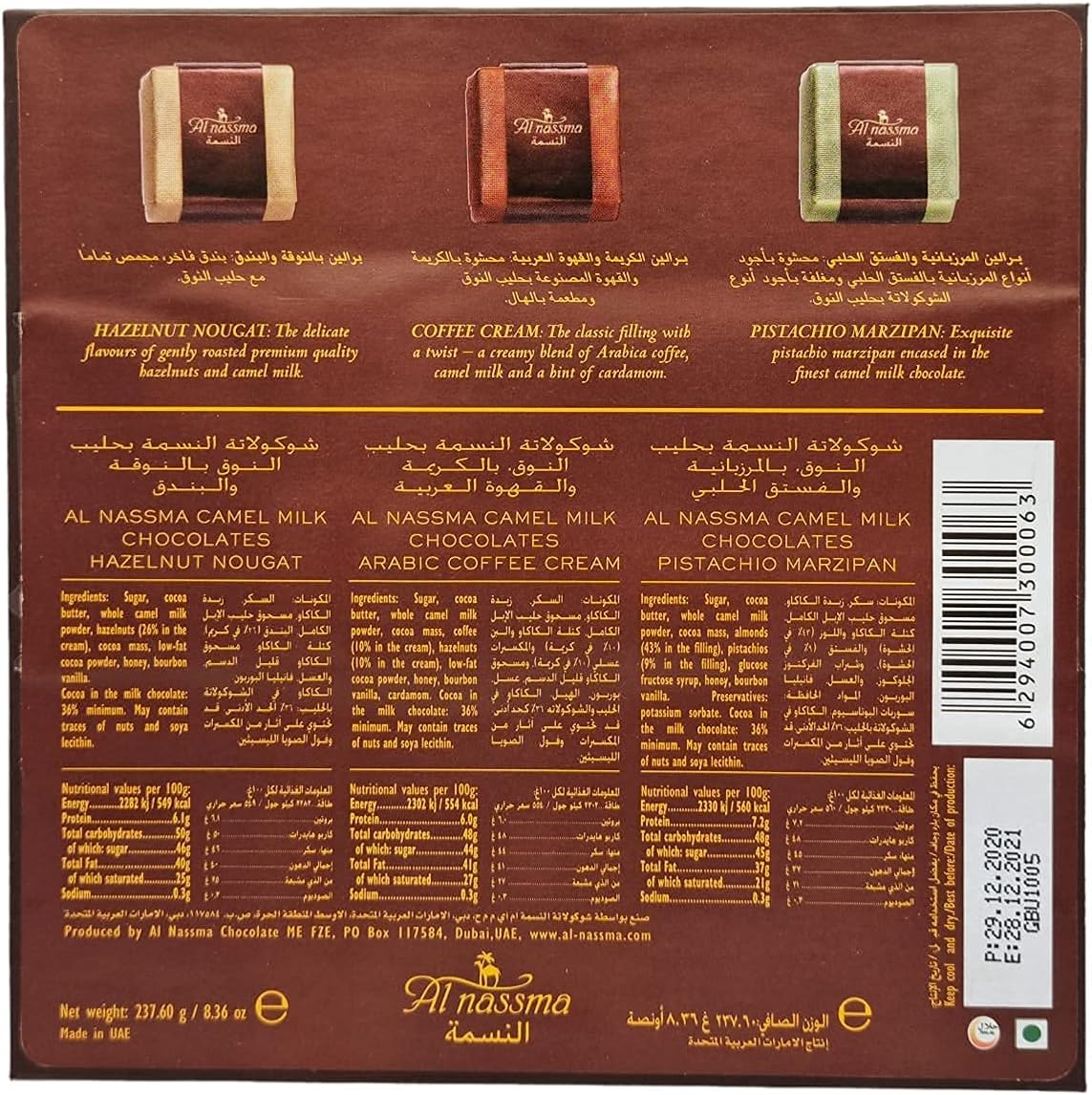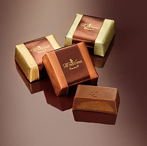 Al Nassma Camel Milk Chocolate Praline Gift Box (18 Piece Pralines: Hazelnut Nougat, Arabic Coffee, Pistachio Marzipan) | Made in Dubai Luxury | For Birthdays, Souvenir, Valentines Christmas New Years